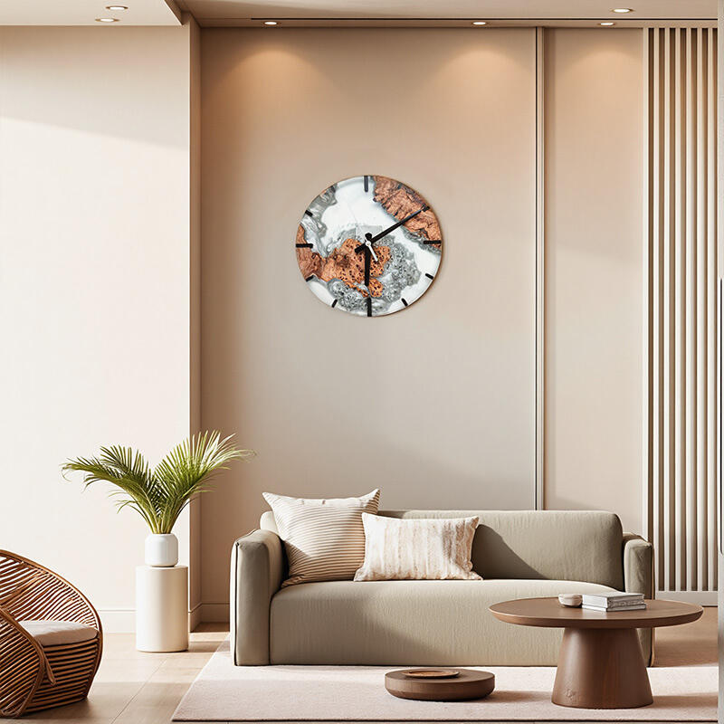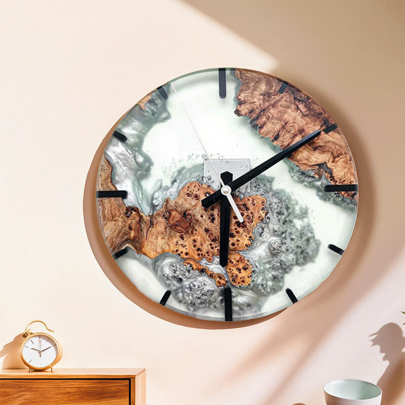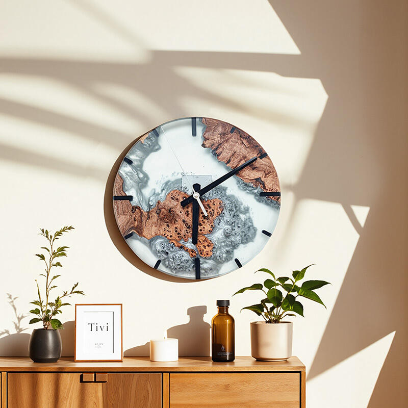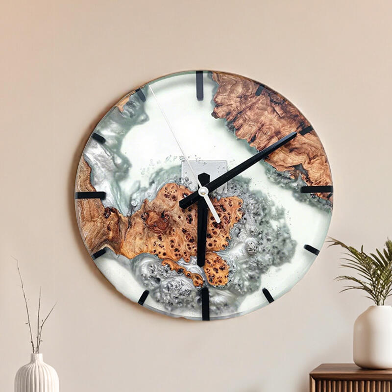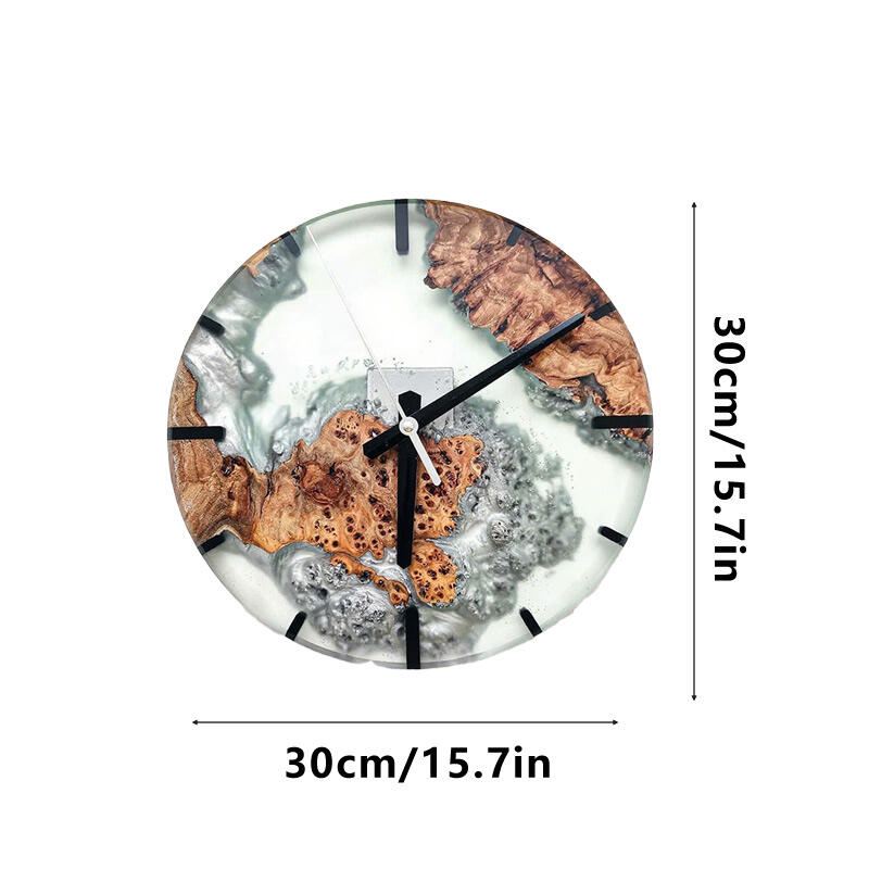 Dear enthusiasts of contemporary and nature-inspired design! Our Reslol art clock is a captivating creation that marries the transparency of resin with the warmth of wood. This combination results in a clock that not only tells time but also serves as a beautiful decorative element.