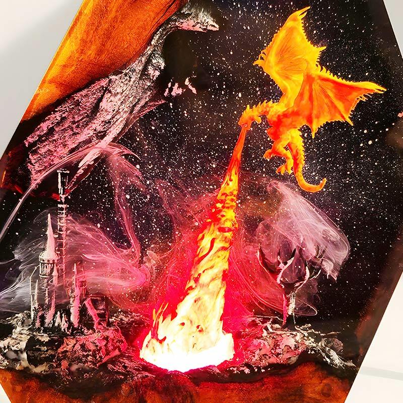 Dear design enthusiasts! Discover our Reslol resin lamp, a true standout piece. This lamp is inspired by a fire-breathing dragon, an element that comes to life within its irregular form.