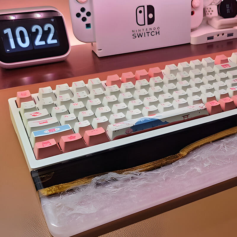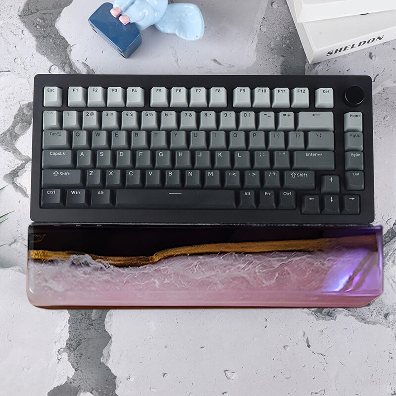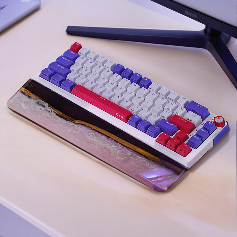 The soft pink resin exudes a warm and inviting glow, while the sleek zitan trim adds a touch of luxury. Each wrist rest is meticulously handcrafted, embodying the true spirit of craftsmanship.