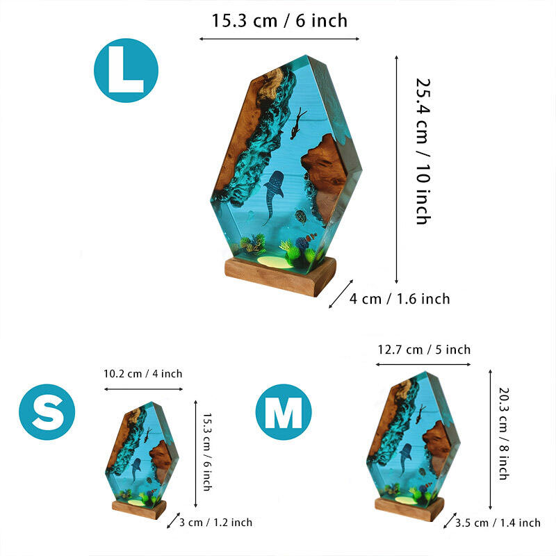 This night light is crafted with a commitment to sustainability, using eco-friendly resin and responsibly sourced wood. The design features a majestic whale shark gliding through the ocean depths, accompanied by a fearless diver. These elements are intricately detailed, bringing the magic of the ocean right into your living space.