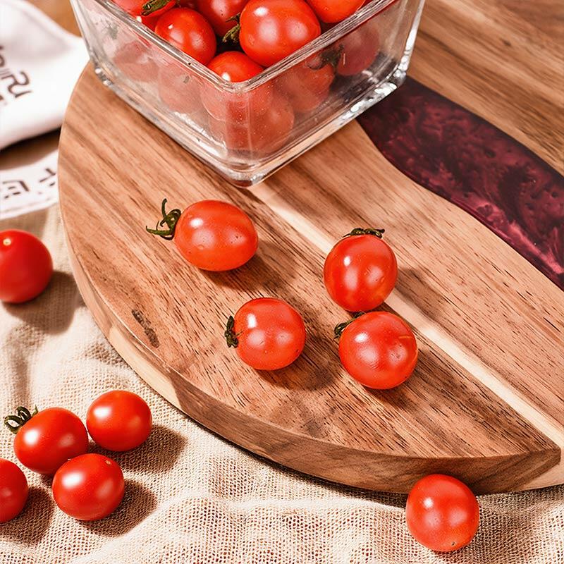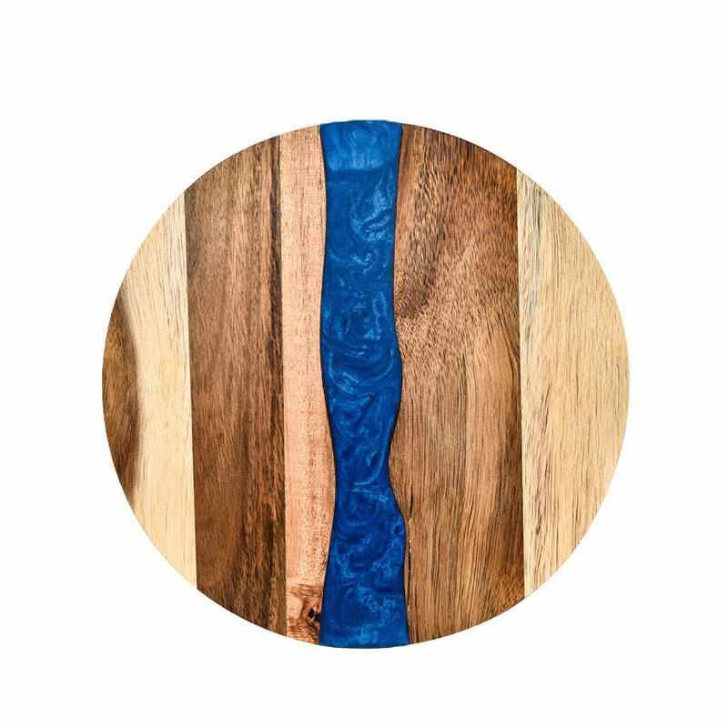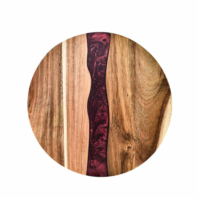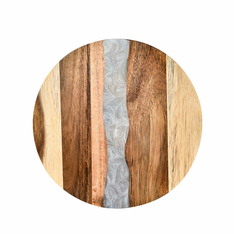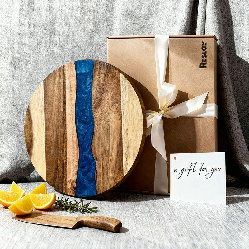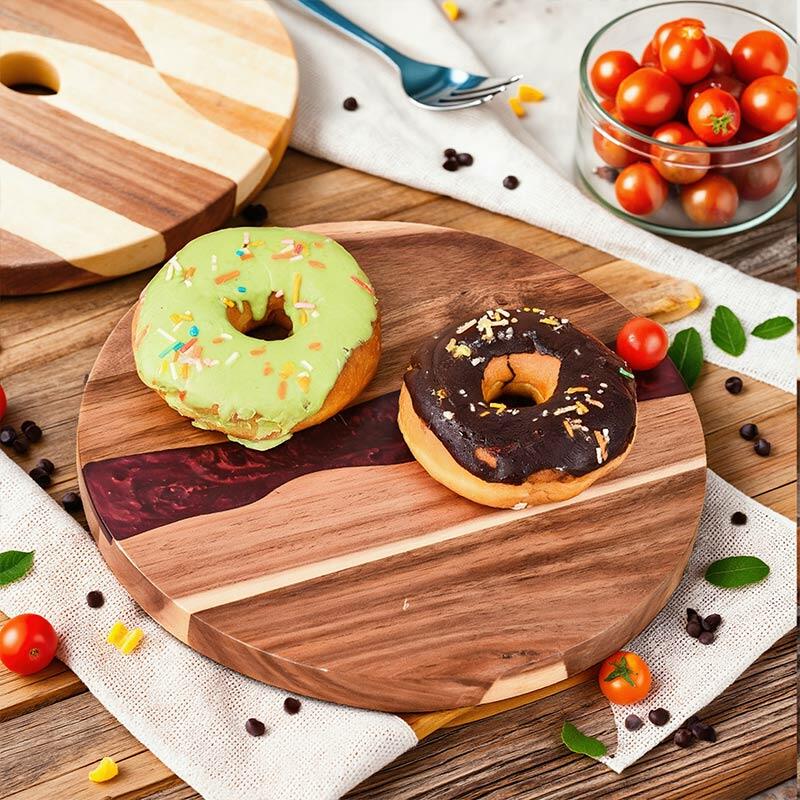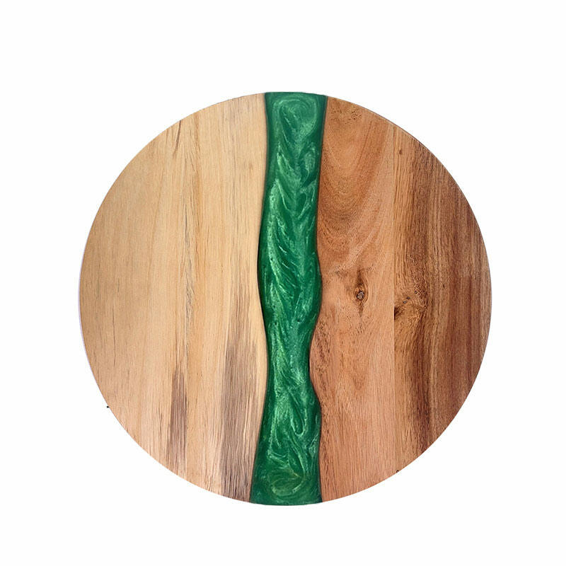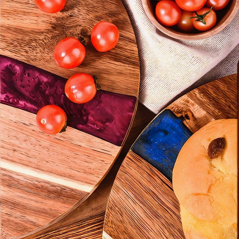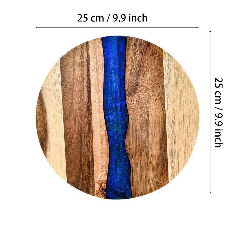 Hey, lovers of beautiful and practical kitchenware! Check out our Reslol round cutting board, where the magic of resin - joined acacia wood unfolds. The round shape gives it a classic and versatile look, fitting seamlessly into any kitchen decor. The epoxy resin and acacia wood combination not only offers a sturdy and reliable cutting surface but also showcases an artistic aesthetic.