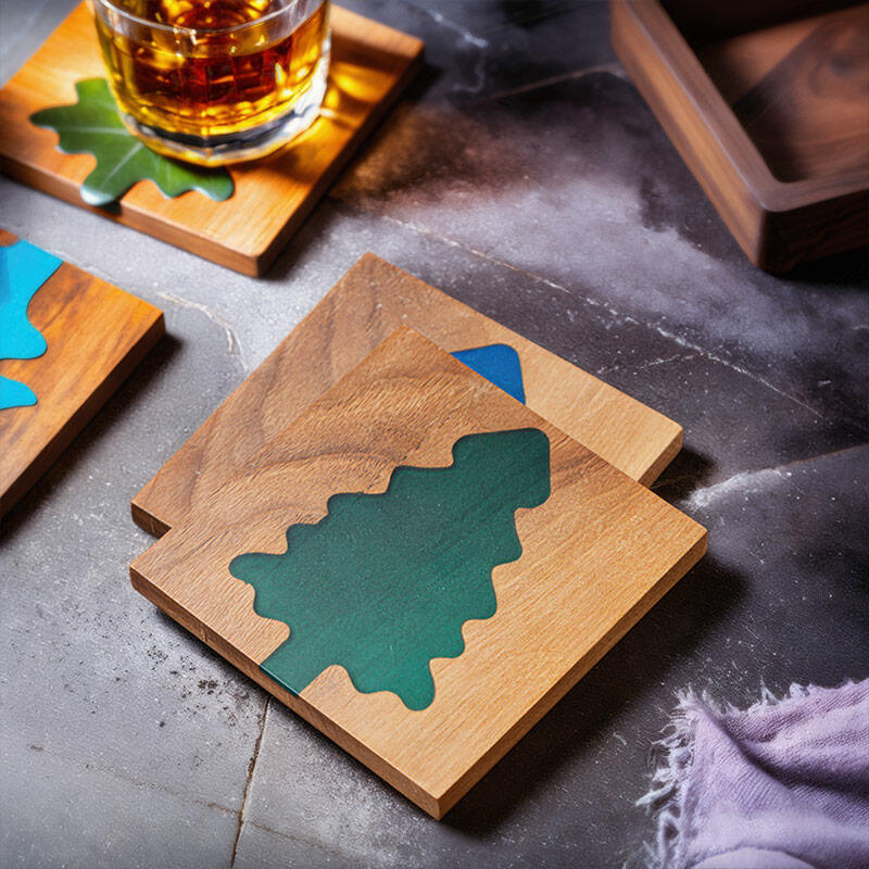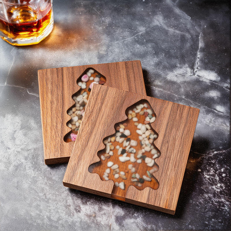 The resin is then masterfully combined with the walnut. It not only encases and protects the wood but also creates a smooth, transparent surface that enhances the overall beauty of the coasters. The resin's clear finish allows the beauty of the walnut and the intricate details of the Christmas tree designs to shine through.
