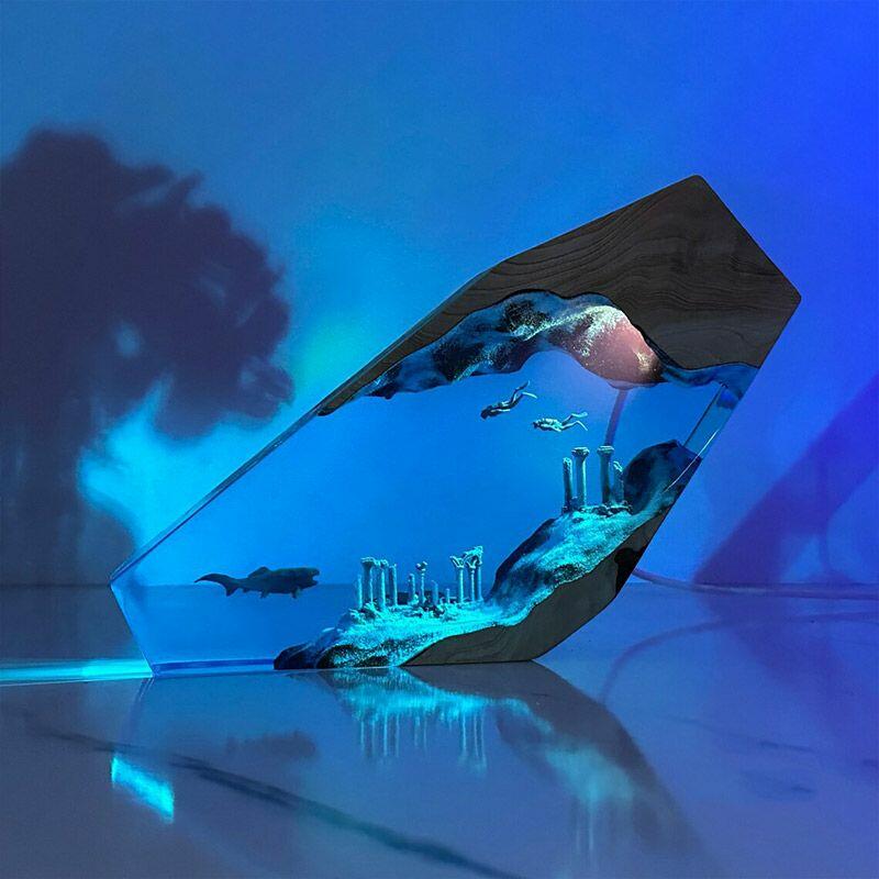 Vintage Ocean Explorer Resin Lamp | Shark & Diver Handcrafted Art Piece