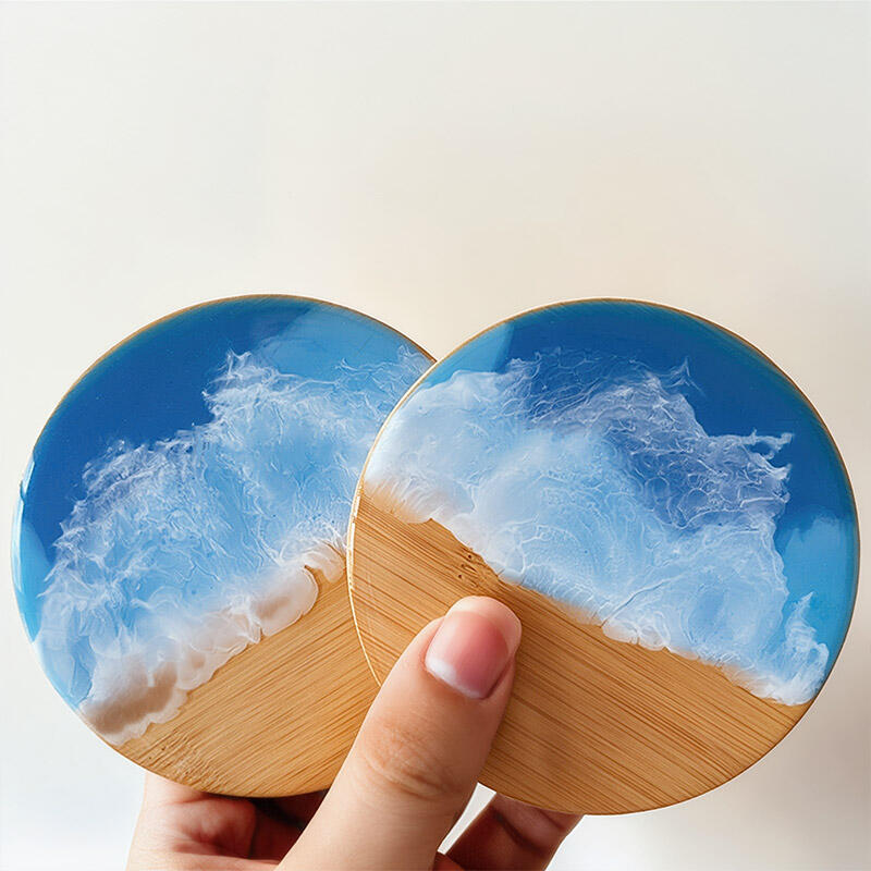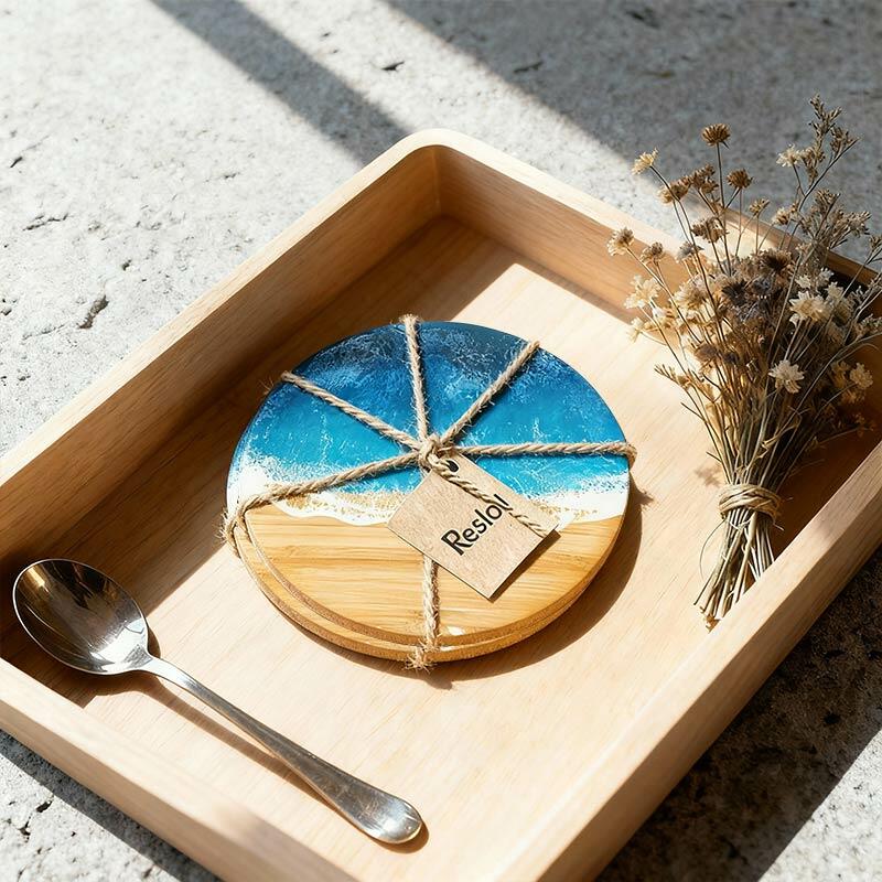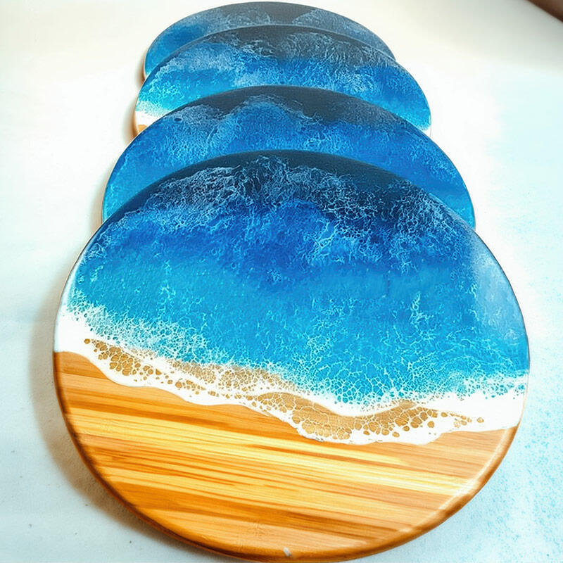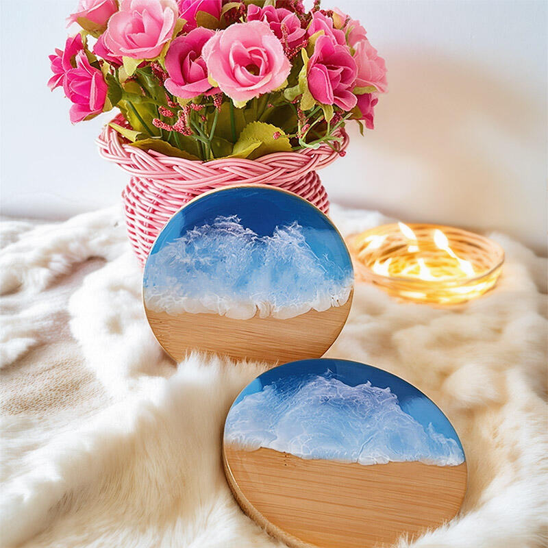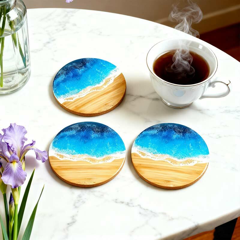 Hey there, ocean enthusiasts! Discover the allure of our Reslol Exquisite Round Ocean Bamboo & Resin Coasters, brimming with wave and beach elements.