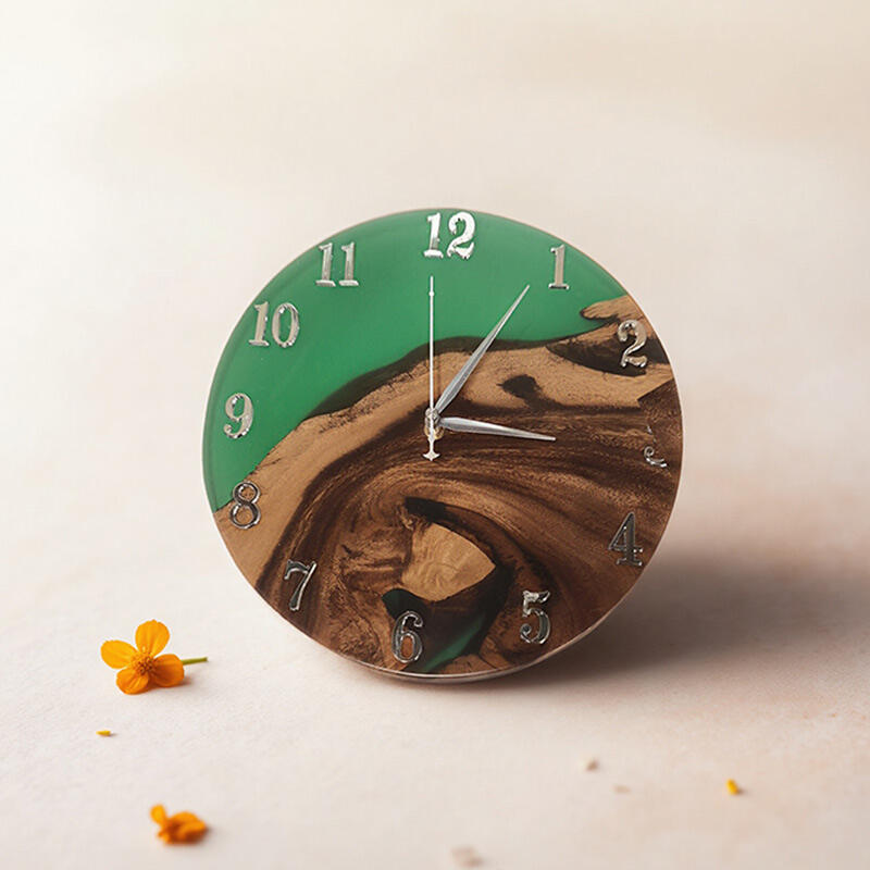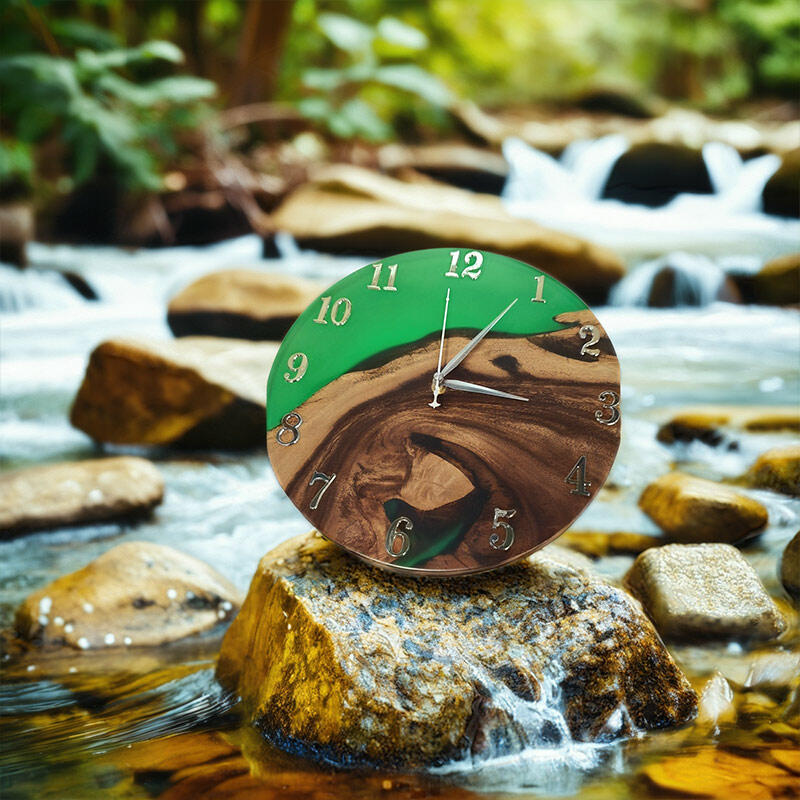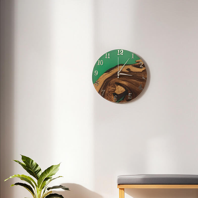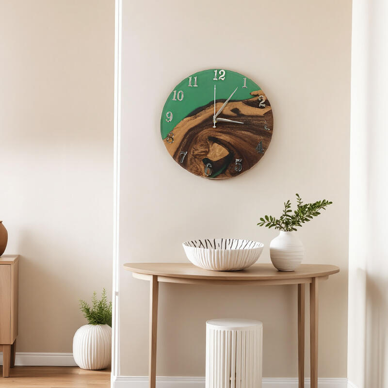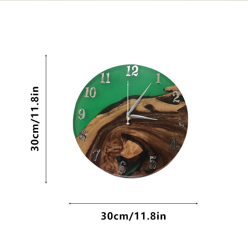 The walnut wood, with its warm, rich hues and unique grain patterns, forms the perfect foundation. It brings a touch of rustic charm and authenticity. The green resin, on the other hand, adds a vibrant and refreshing element. Its flowing and organic form creates an eye-catching contrast against the walnut wood, making this wall clock a visual delight.