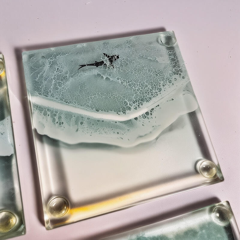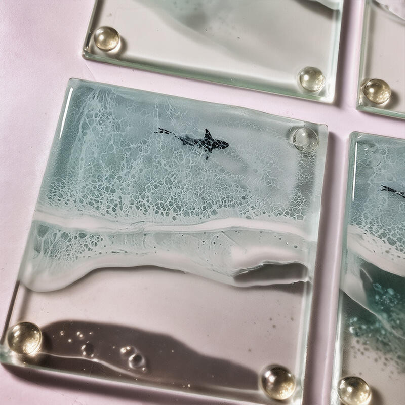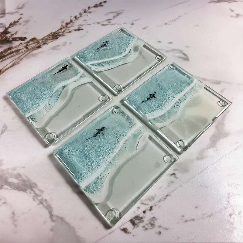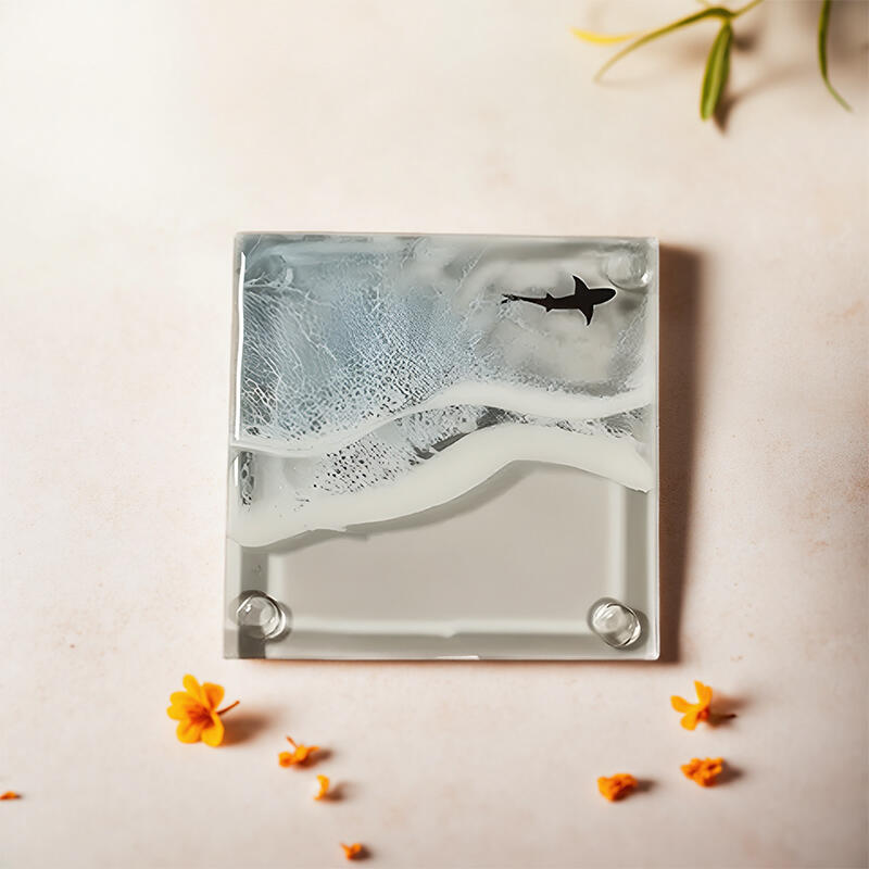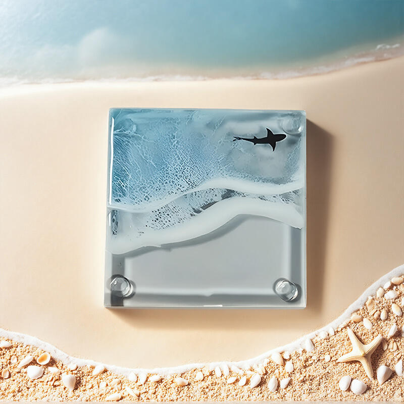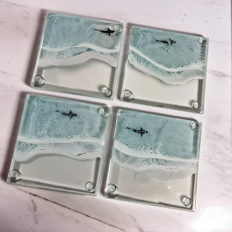 The square shape provides a unique canvas for the vivid imagery of sharks swimming through the ocean depths. The designs are filled with rich colors and intricate details, from the sleek bodies of the sharks to the foaming waves. The resin used not only protects the print but also gives the coasters a three-dimensional effect, making the ocean scene come to life.