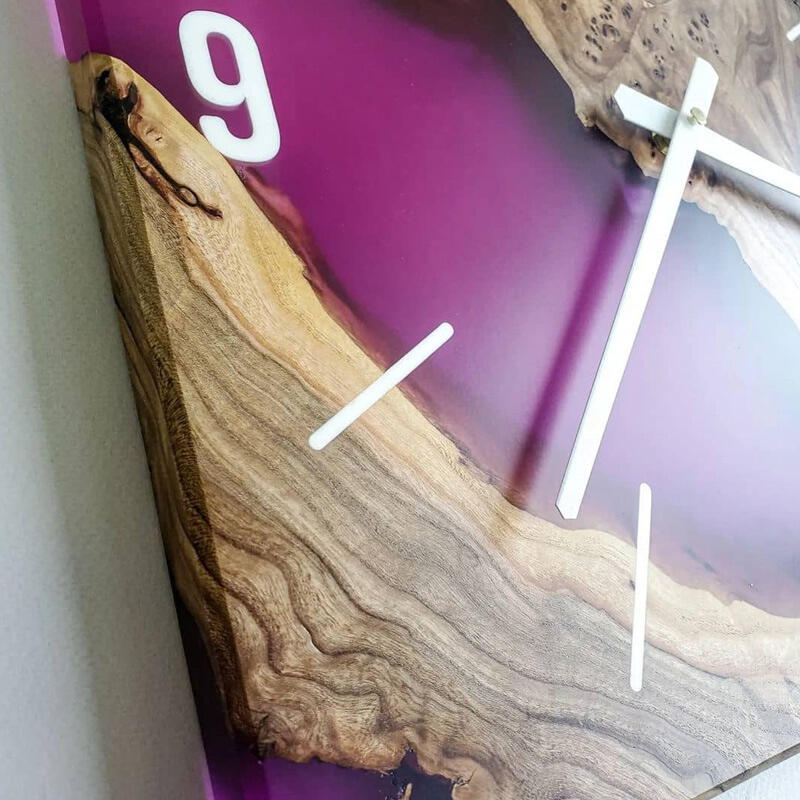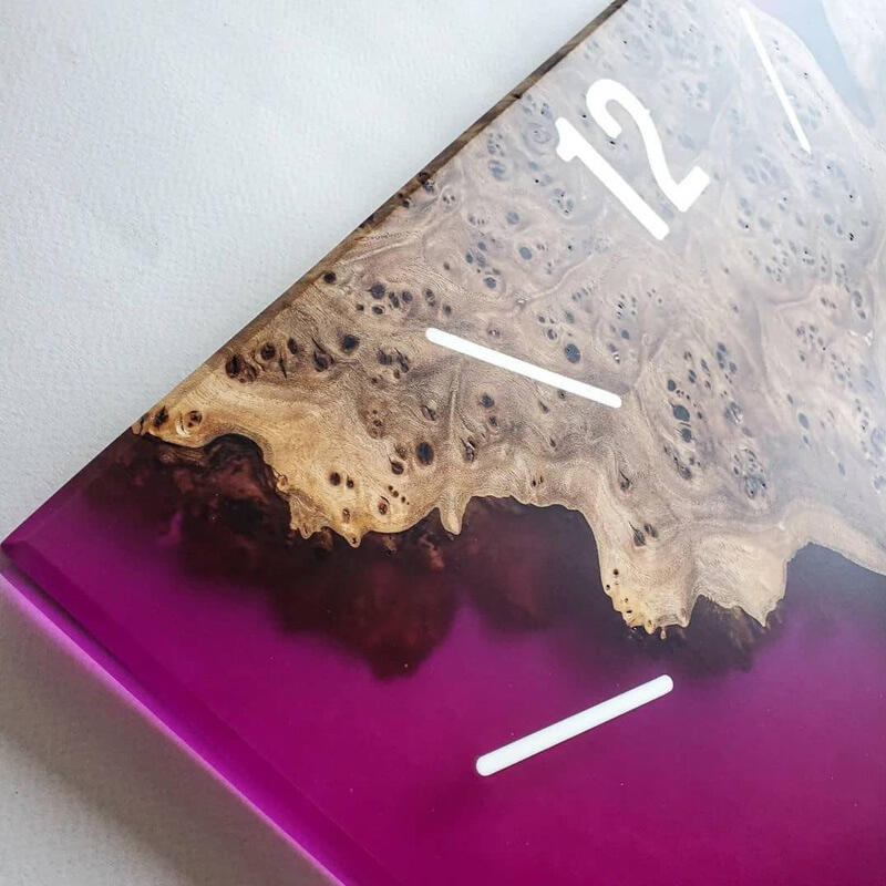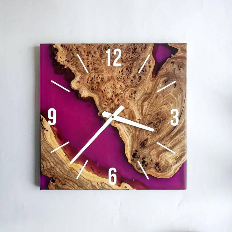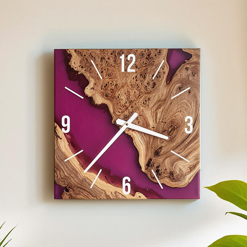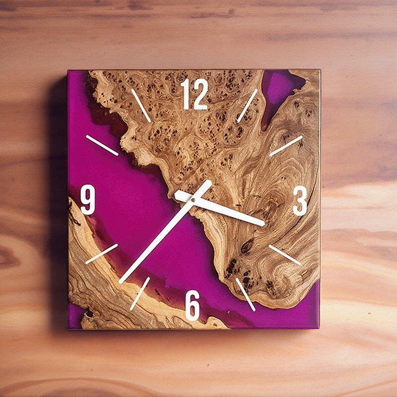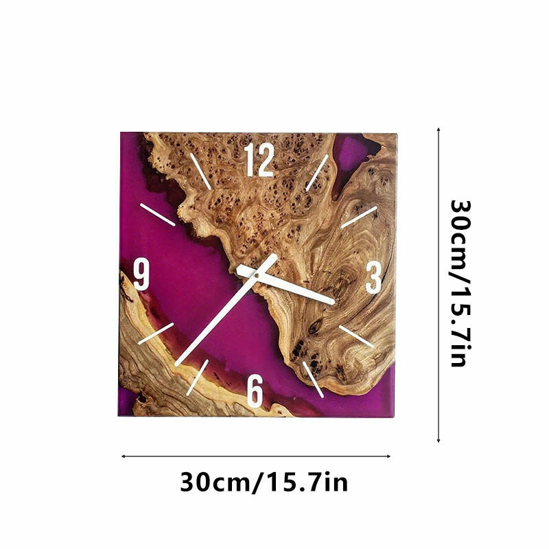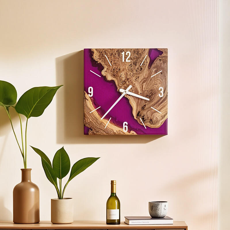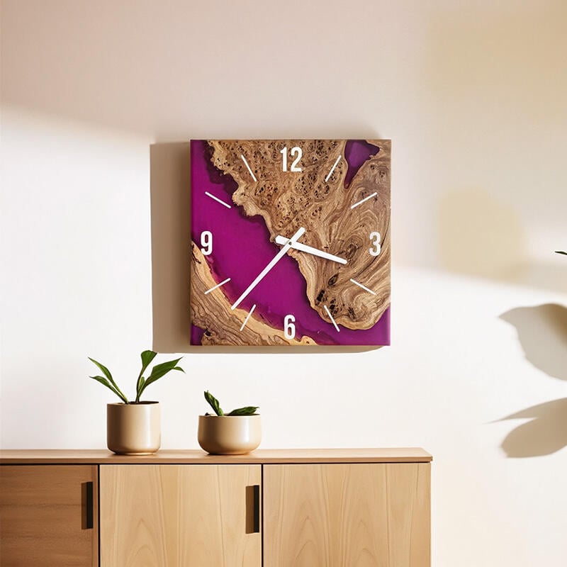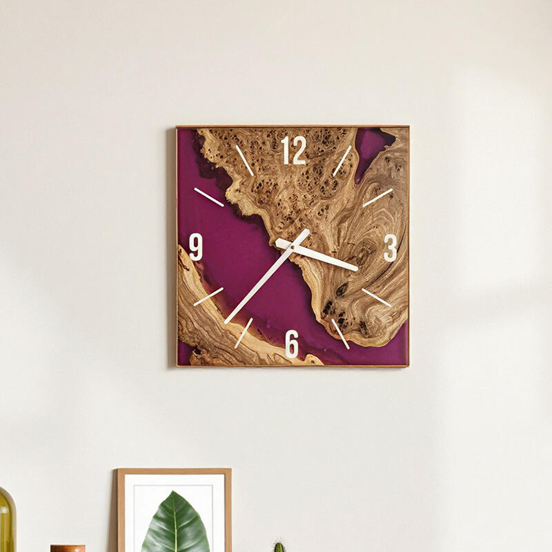 Hey, lovers of modern and abstract aesthetics! Our Reslol square art clock is here to elevate your decor game. The eye-catching pink-purple resin and wood combination in a square shape offers a unique and stylish look that stands out.