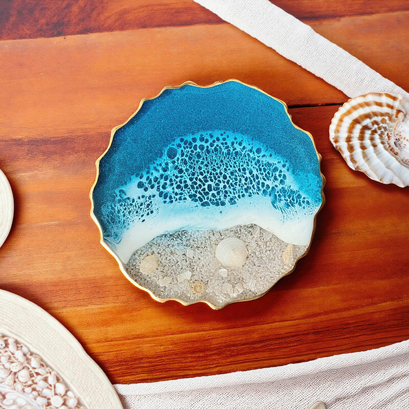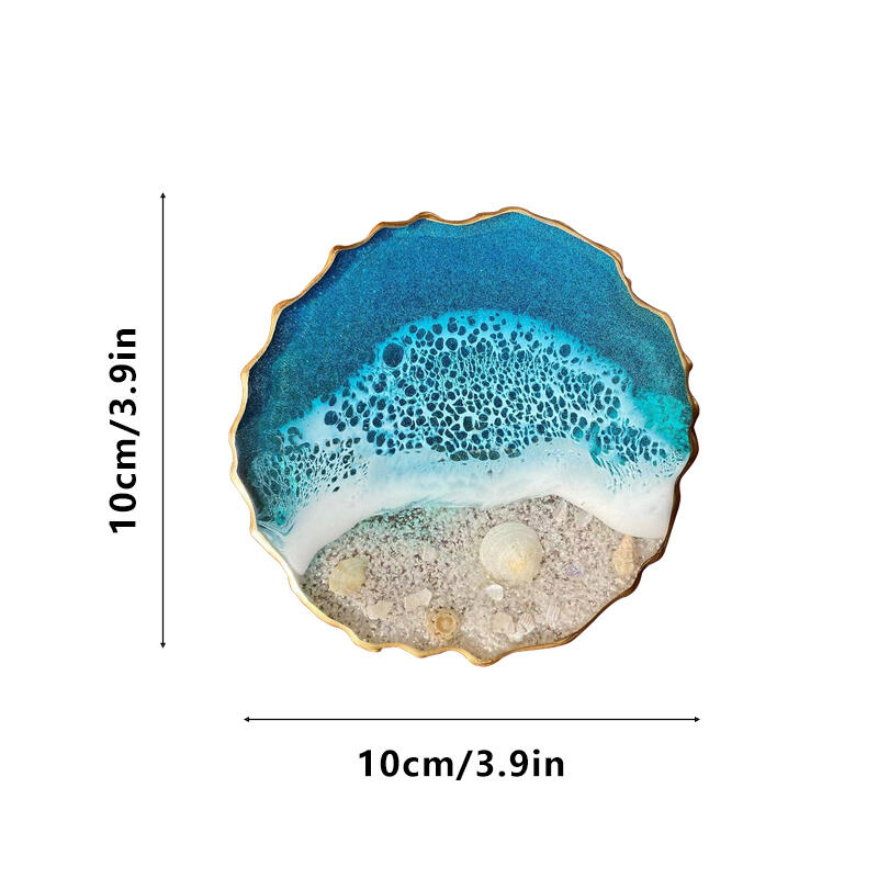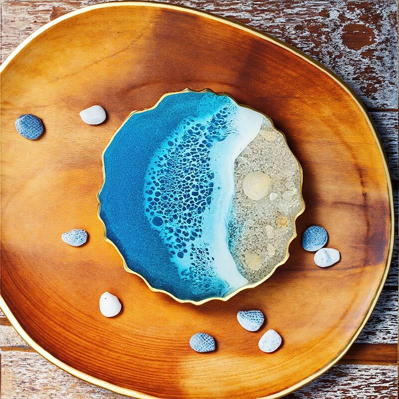 These coasters are a harmonious blend of the ocean's allure and luxurious golden accents. The golden adornments add a touch of opulence, enhancing the beauty of the already captivating ocean-inspired design. Real shells, carefully selected for their unique shapes and textures, are incorporated, bringing the essence of the seashore. The wave patterns, with their fluid and dynamic forms, create a sense of movement, as if the ocean's energy is right at your fingertips.