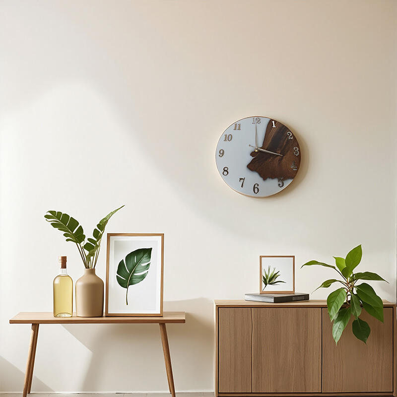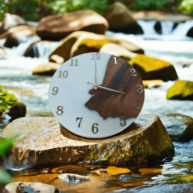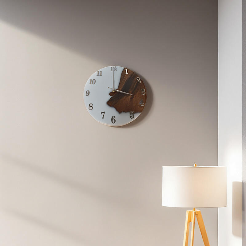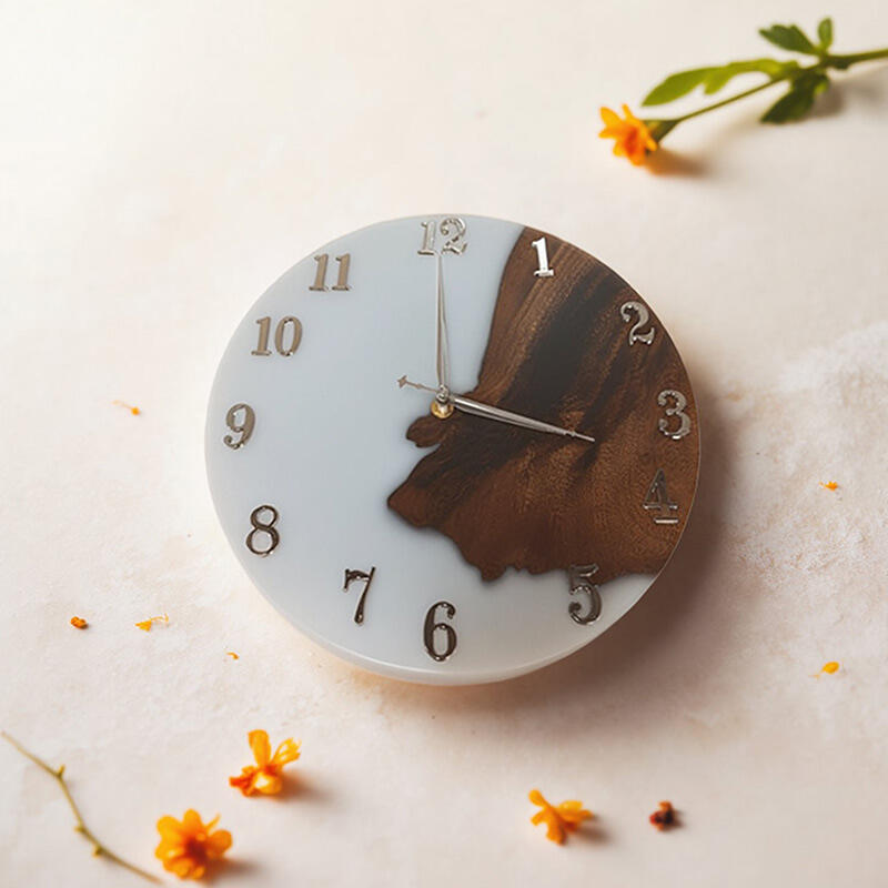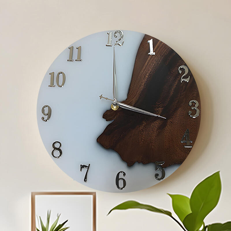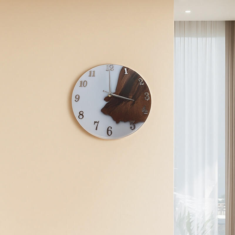 Introducing the Reslol Gorgeous Walnut Wood & White Resin Art Wall Clock. This isn't just an ordinary clock; it's a blend of nature's beauty and artistic craftsmanship.