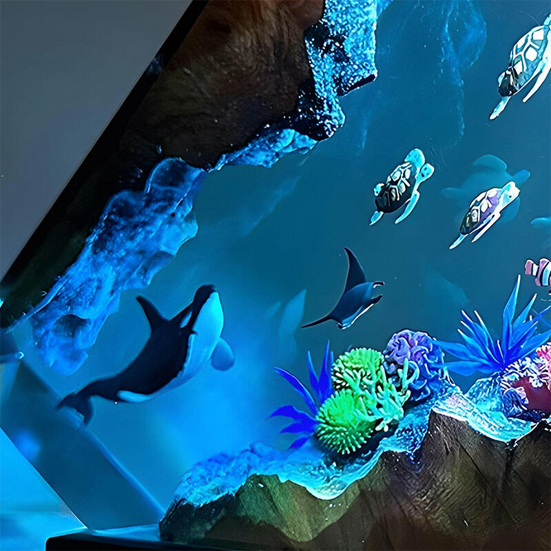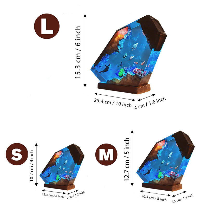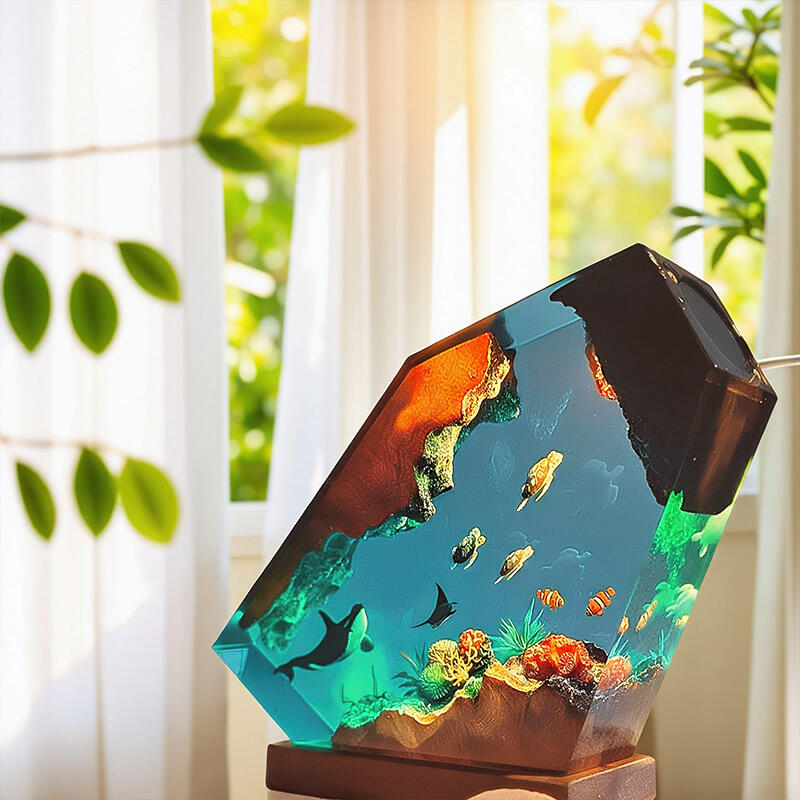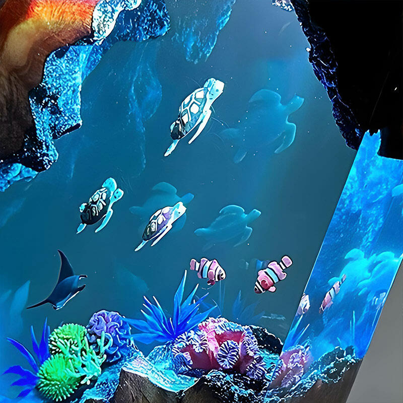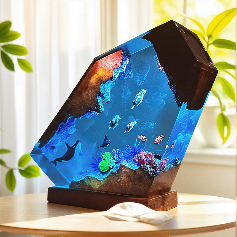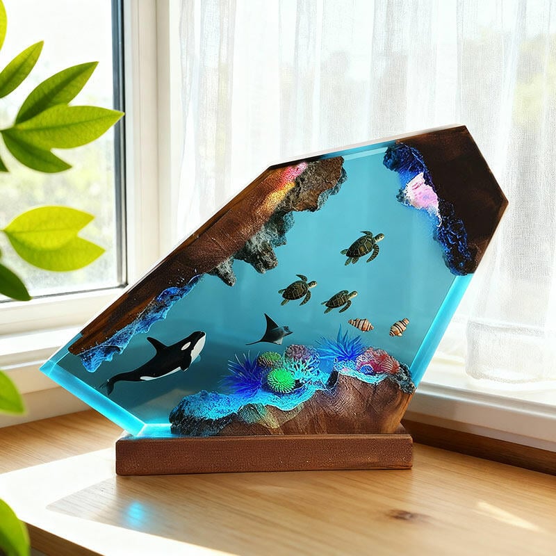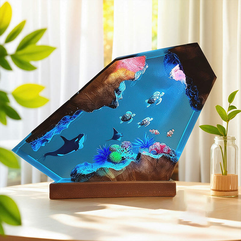 Dive into the mysteries of the deep with Reslol’s Ocean-Themed Epoxy Lamp—a masterpiece where art meets functionality. This handcrafted piece captures the grace of marine life: orcas glide, sea turtles drift, and manta rays soar, all encased in crystal-clear blue resin that mimics the ocean’s depths. Subtle coral and rock textures add depth, while a natural wooden base grounds the scene.