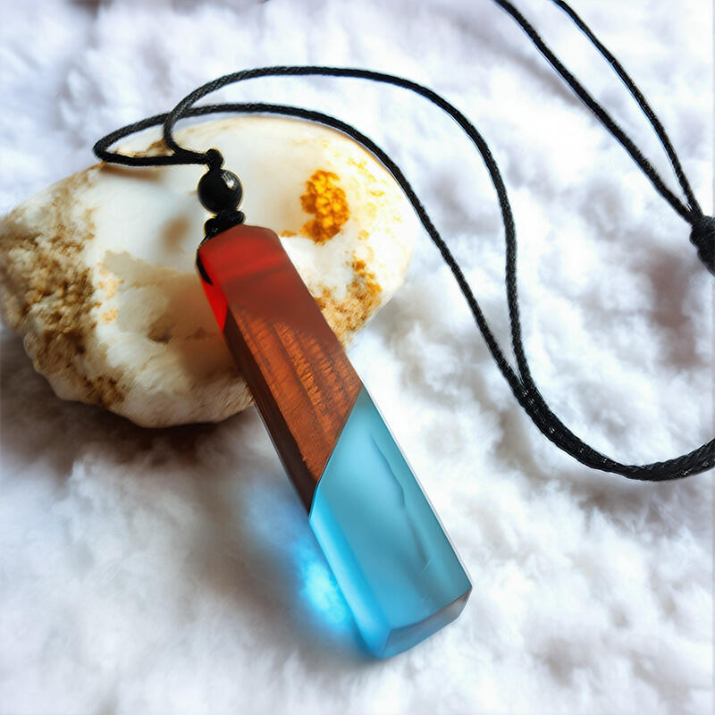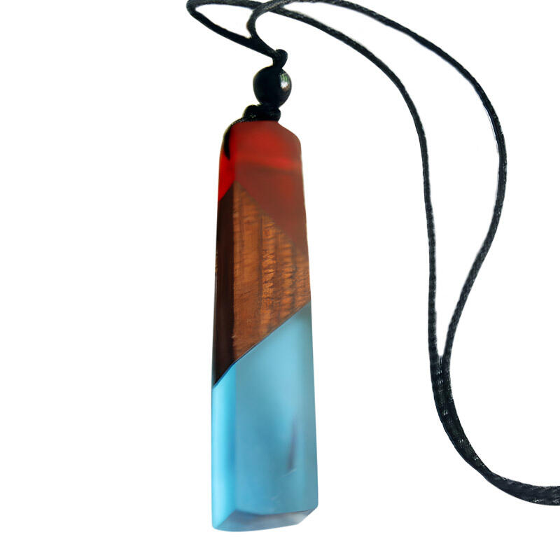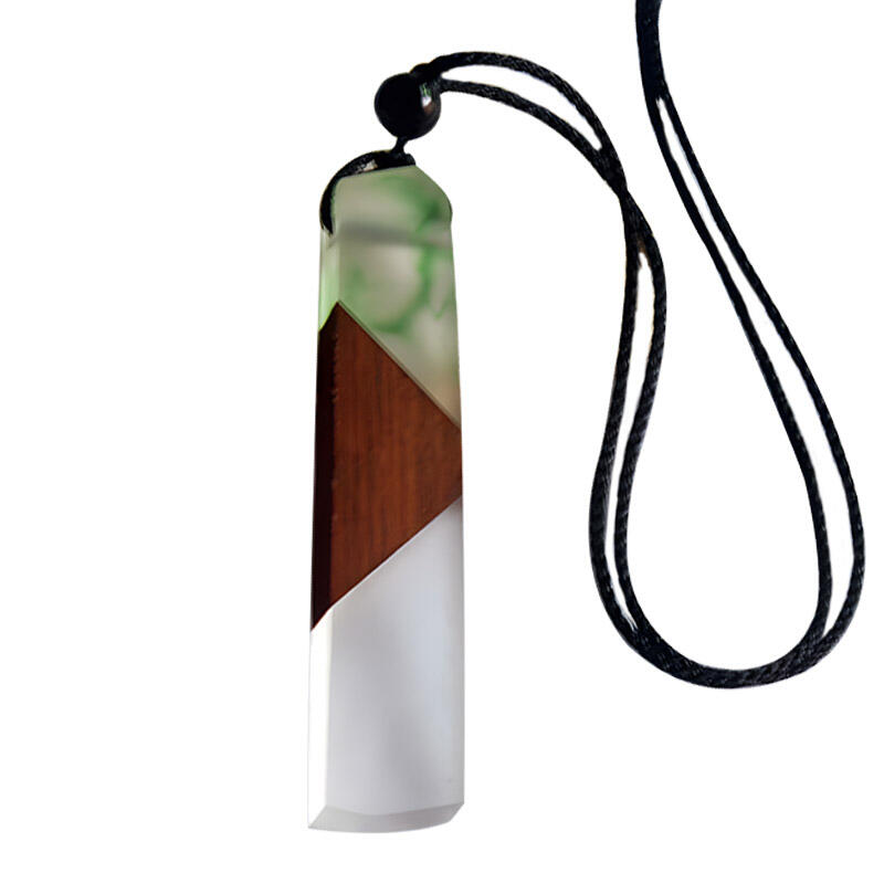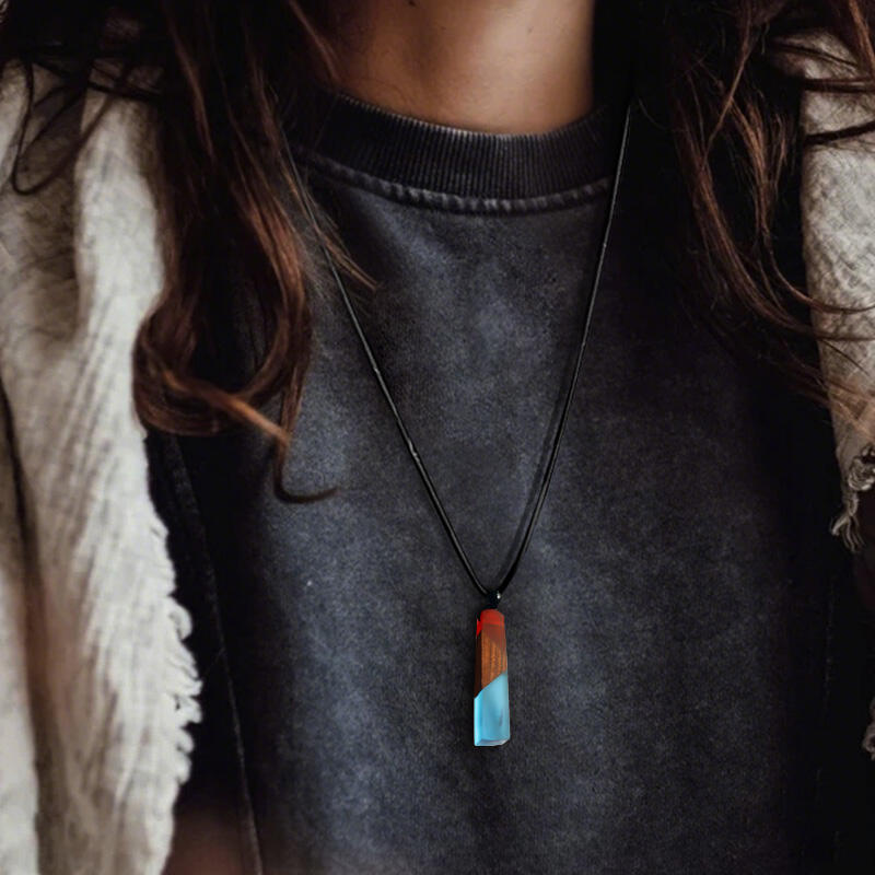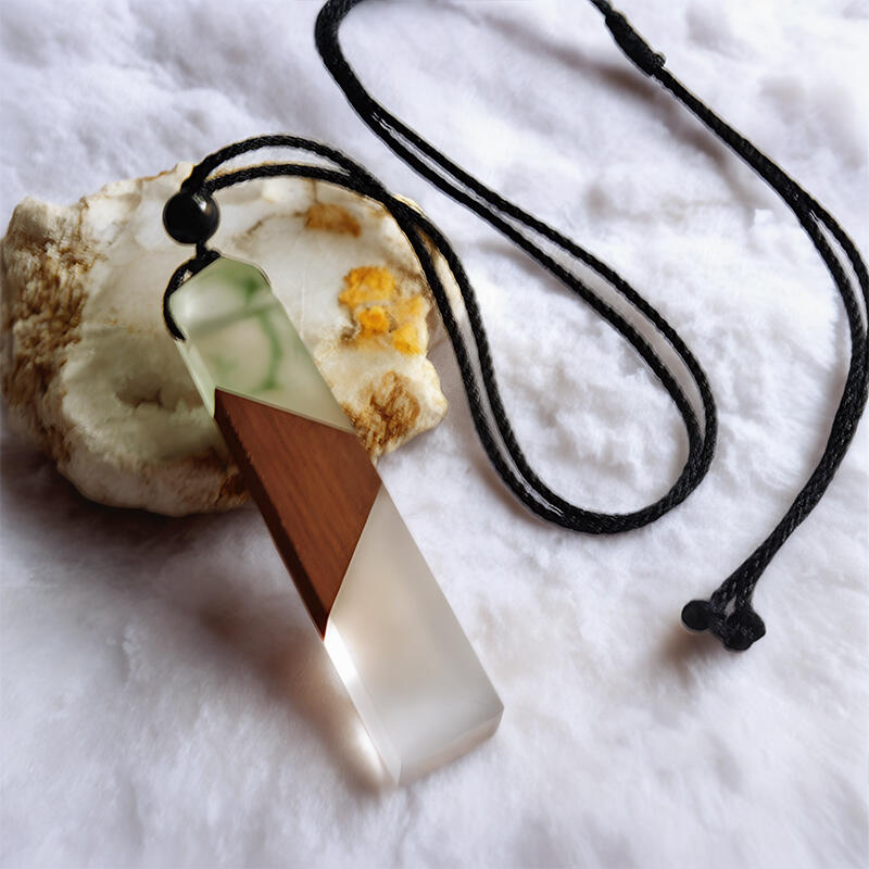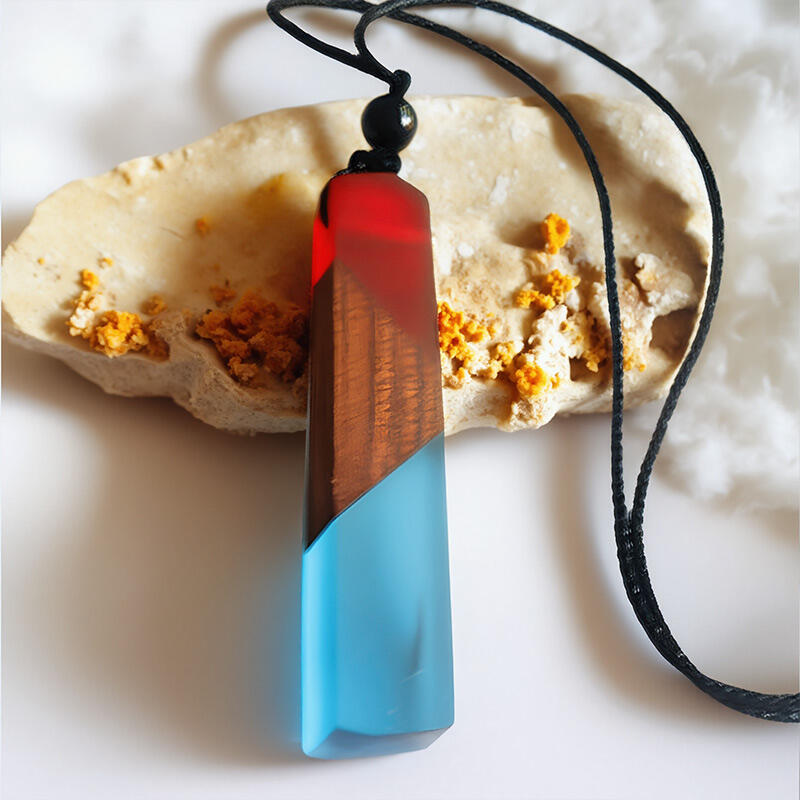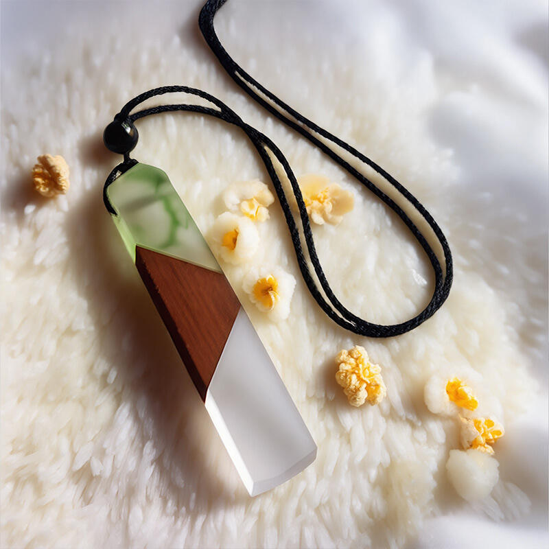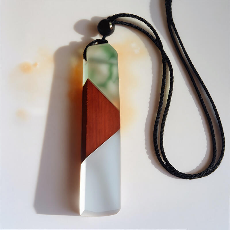 The combination of resin and wood gives it a distinct character. The resin provides a smooth and clear surface, while the wood adds a natural and organic feel. The colorful elements are subtly integrated, giving the necklace a touch of playfulness within its simple design.