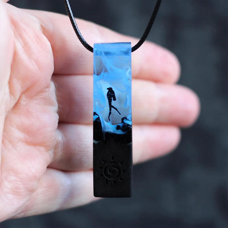 The centerpiece of this necklace is a rectangular pendant featuring a detailed scuba diver design. Crafted from a combination of wood and resin, the pendant brings together the warmth of wood and the sleekness of resin. The glow-in-the-dark feature adds an extra layer of magic, making it come alive in the dark, just like a hidden treasure in the deep sea.