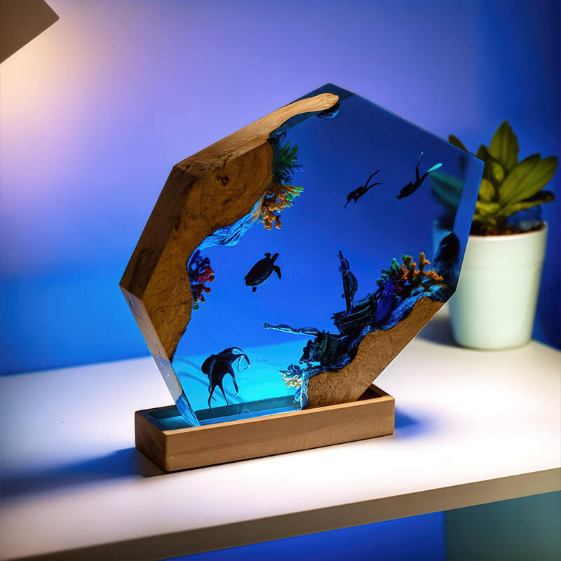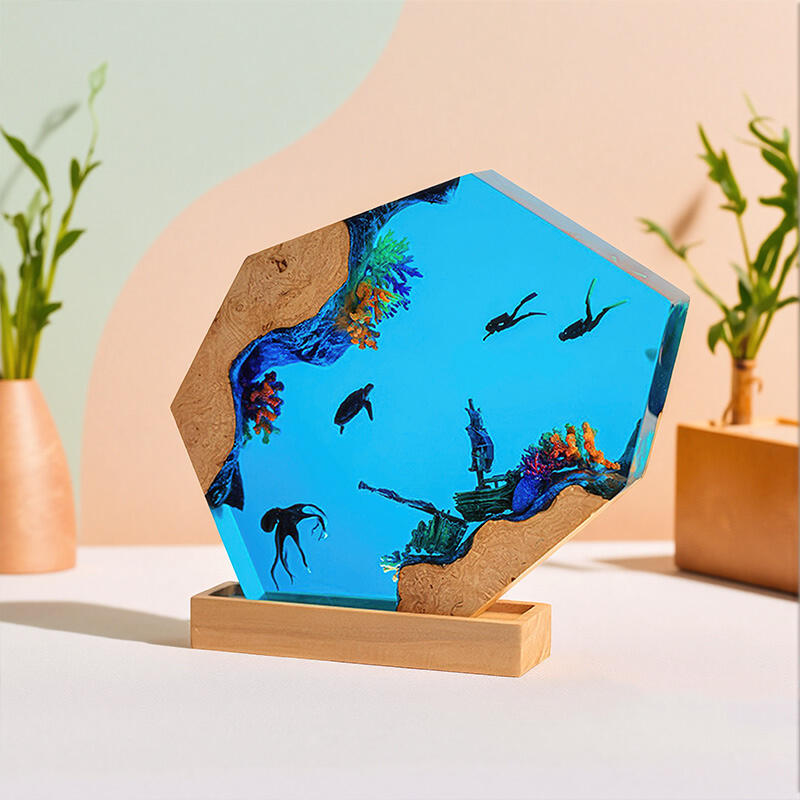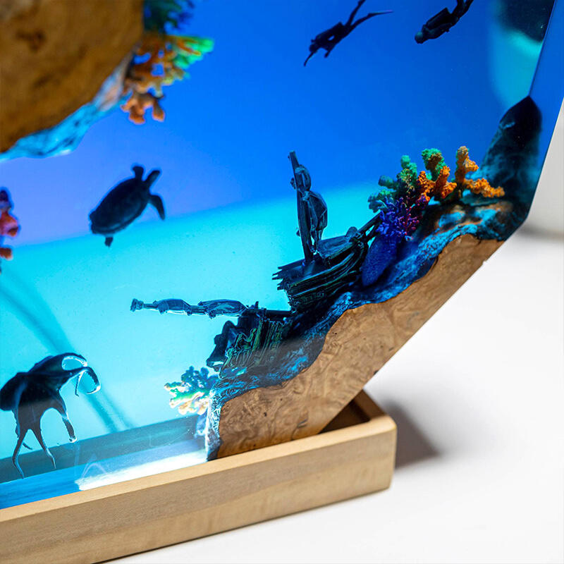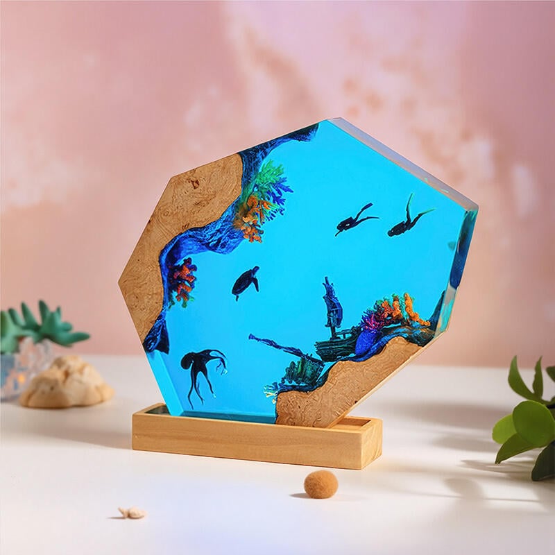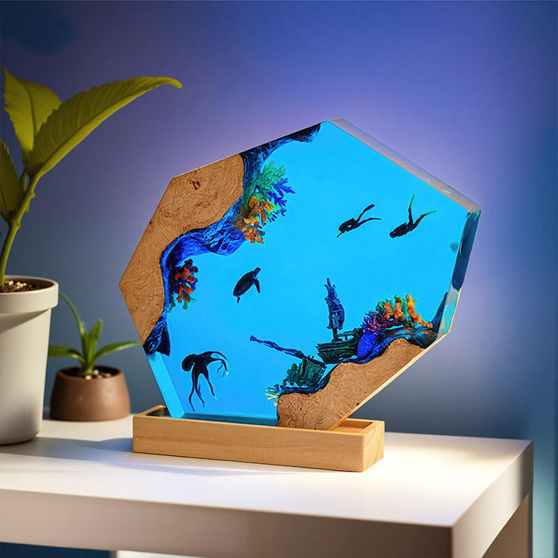 Dear lovers of unique lighting! Check out our Reslol resin night light. This isn't just an ordinary lamp; it's a work of art. The irregular shape gives it a natural and organic feel, while the vivid depictions of divers, turtles, and shipwrecks inside add a touch of mystery and adventure.