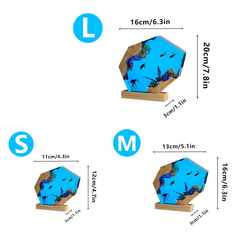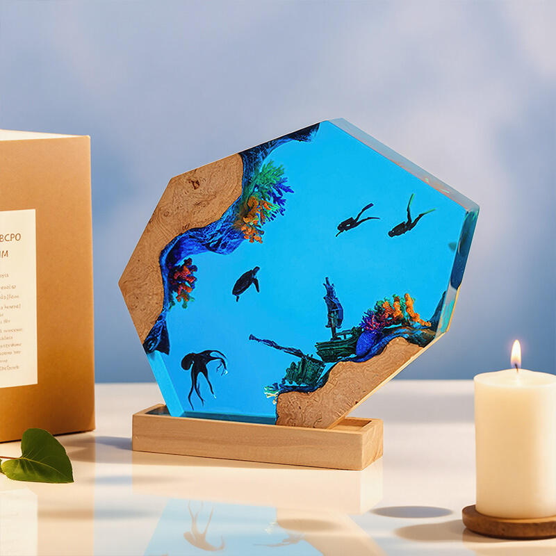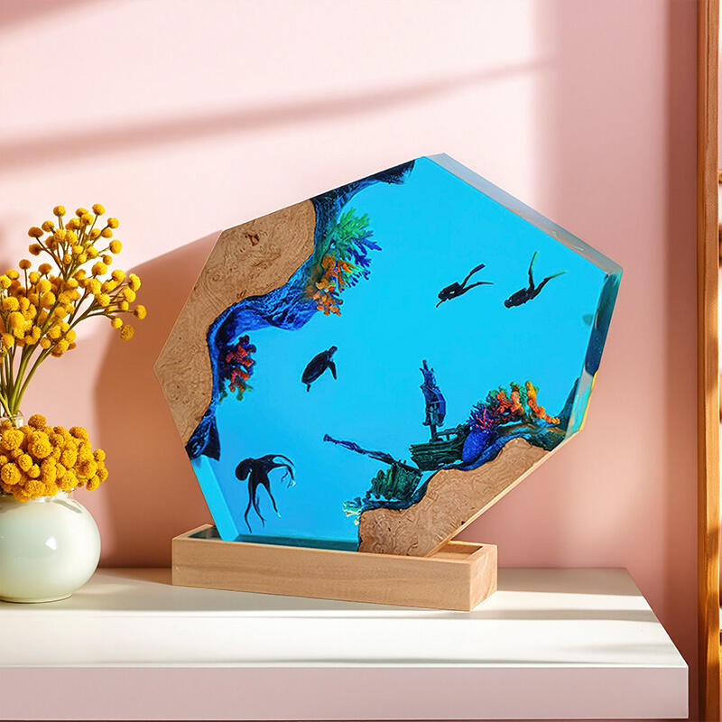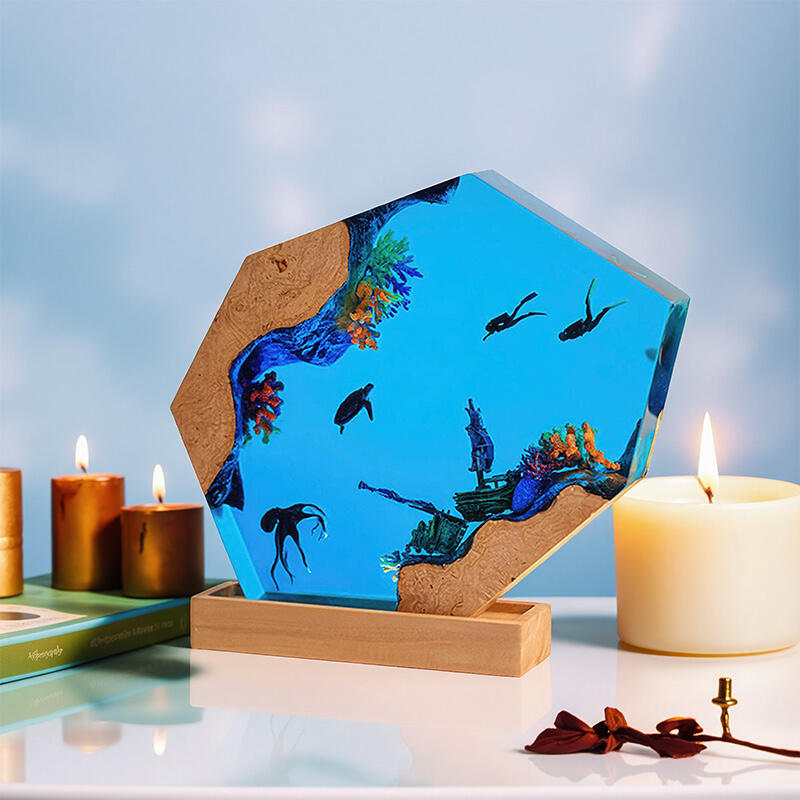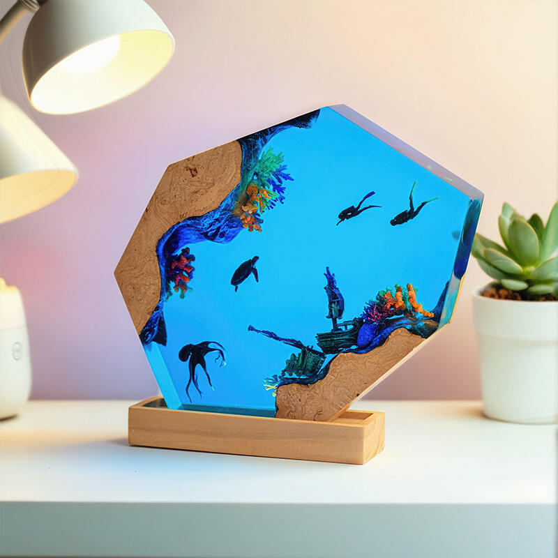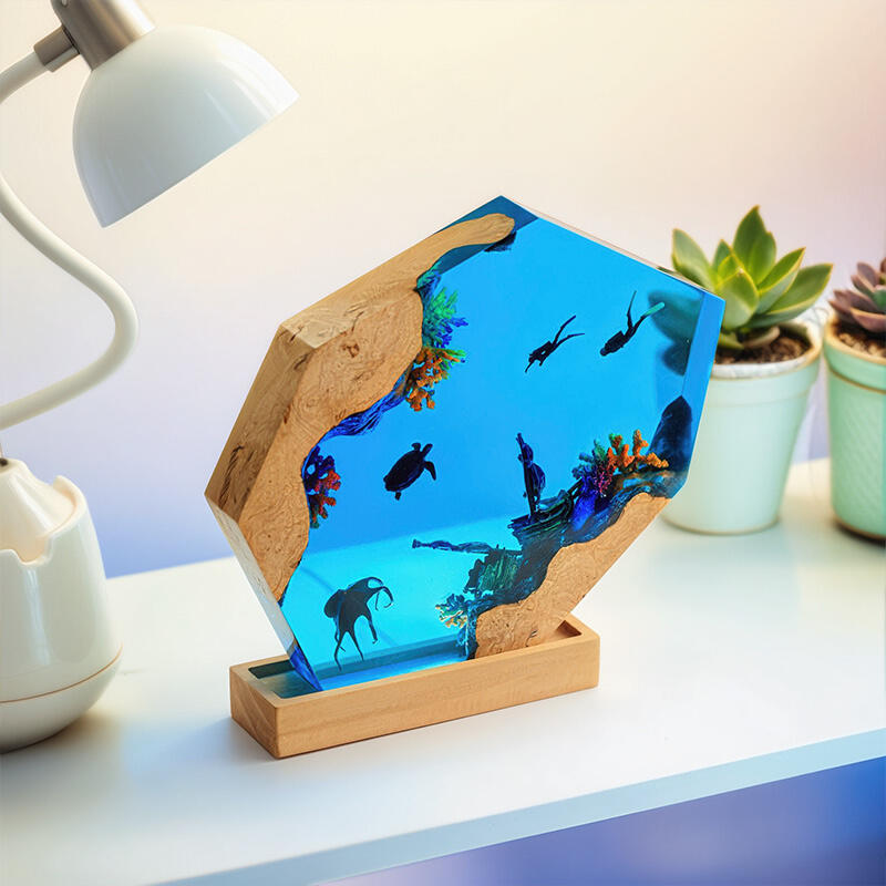 Dear lovers of unique lighting! Check out our Reslol resin night light. This isn't just an ordinary lamp; it's a work of art. The irregular shape gives it a natural and organic feel, while the vivid depictions of divers, turtles, and shipwrecks inside add a touch of mystery and adventure.