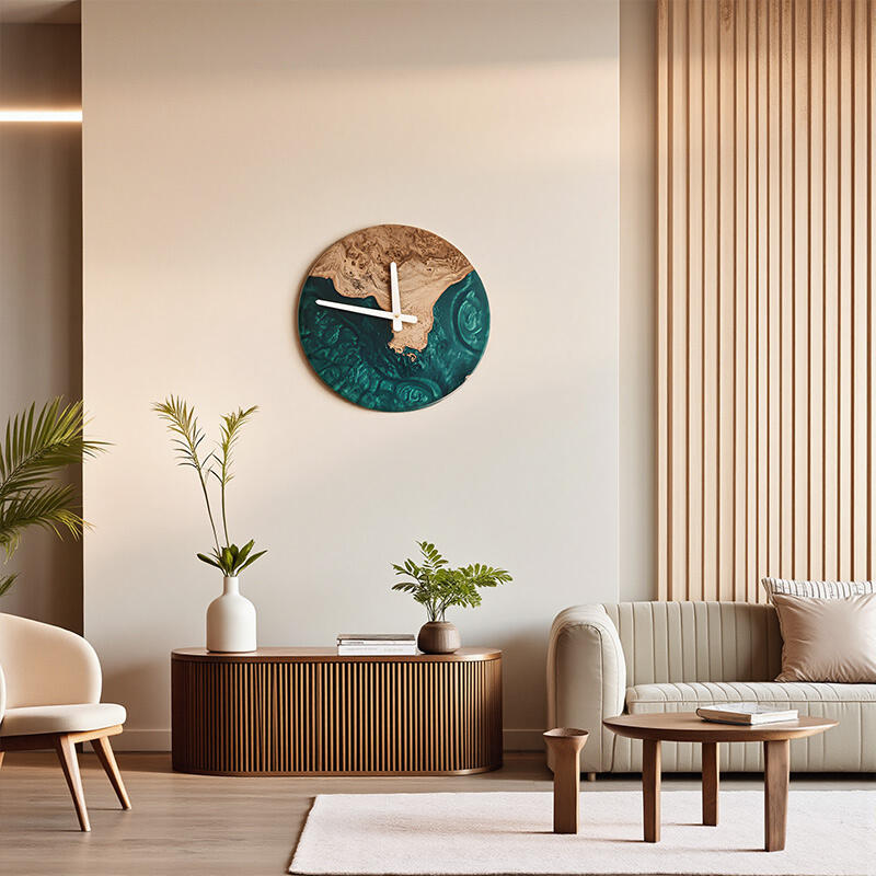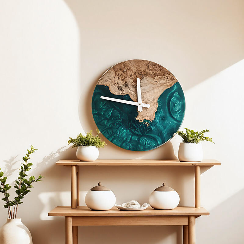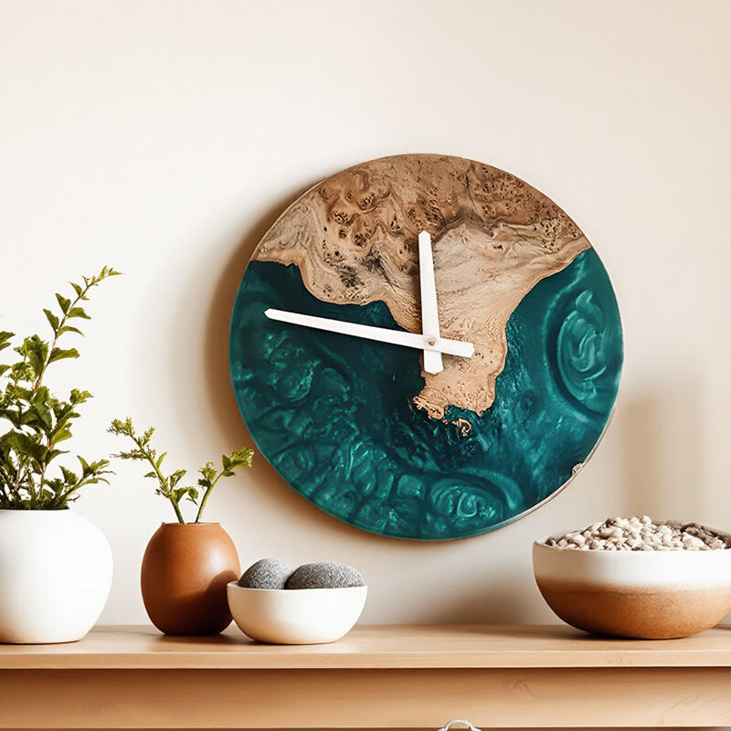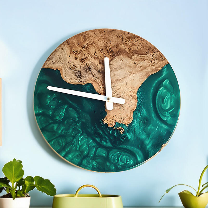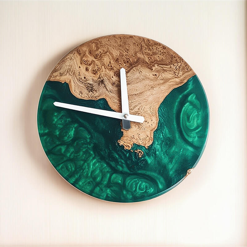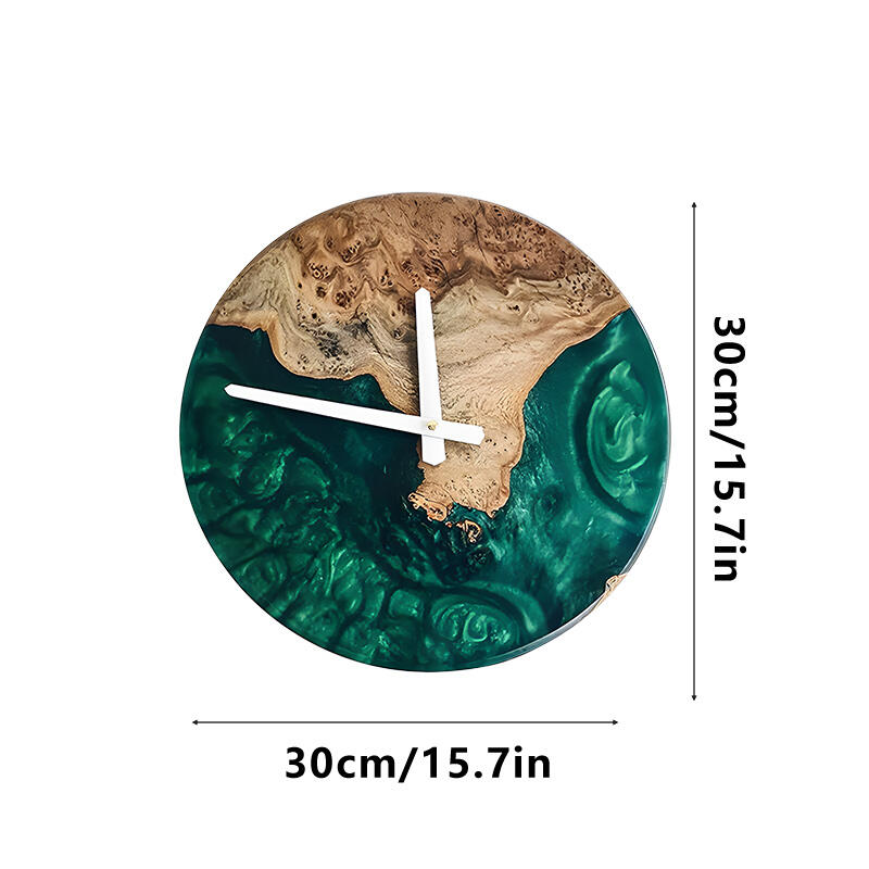 Dear lovers of modern minimalist and nature-inspired art! Our Reslol decorative clock is a harmonious blend of modern design and natural allure. The vivid green resin paired with wood creates a visually stunning piece that infuses any space with a touch of freshness and elegance.