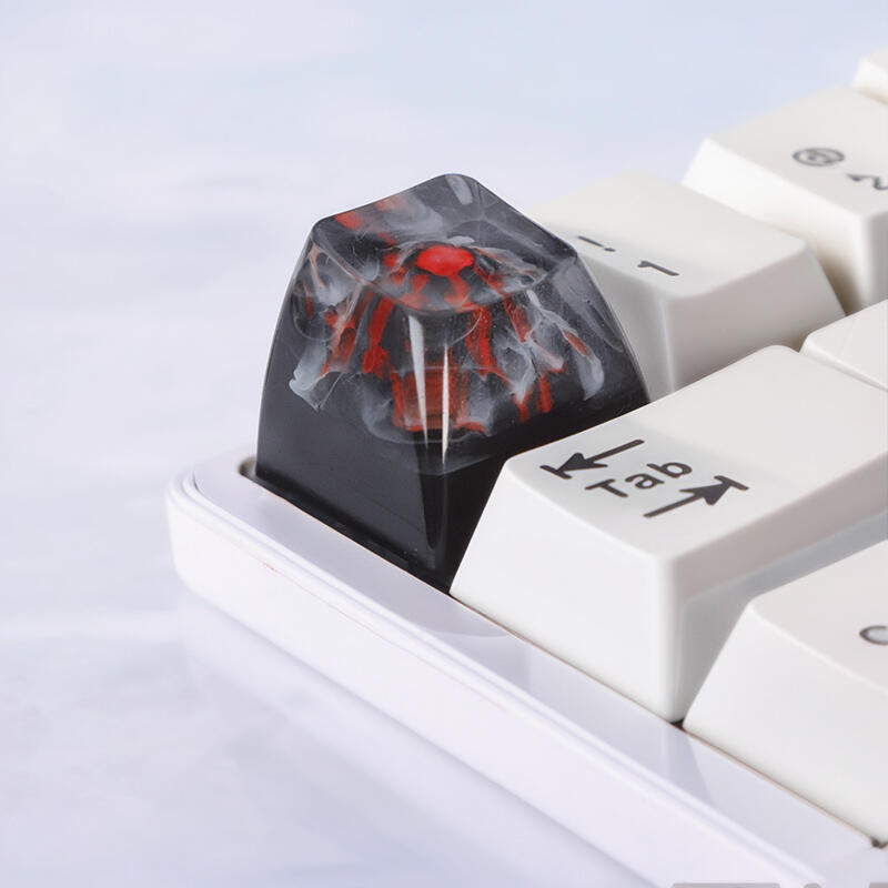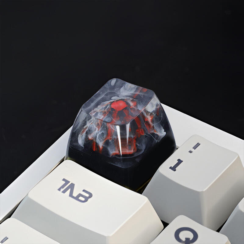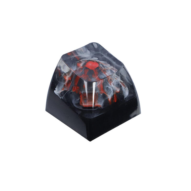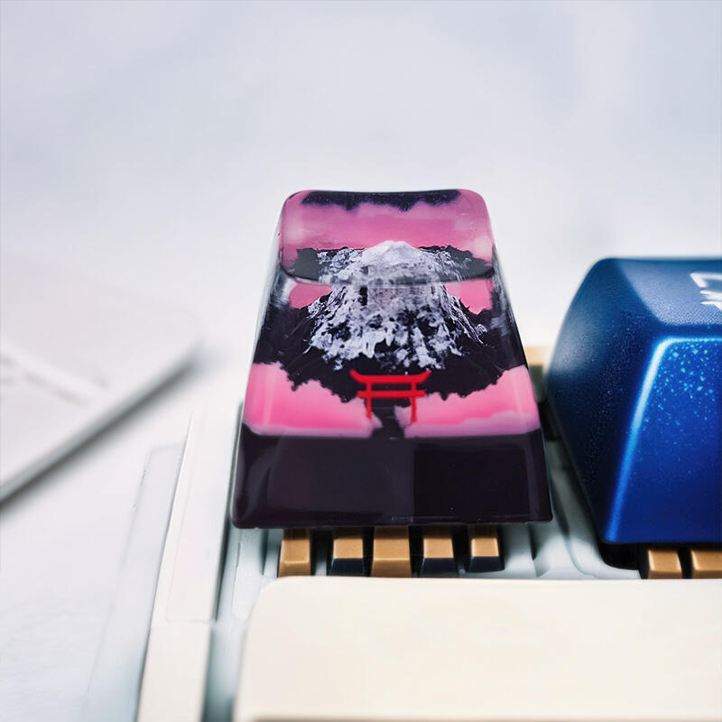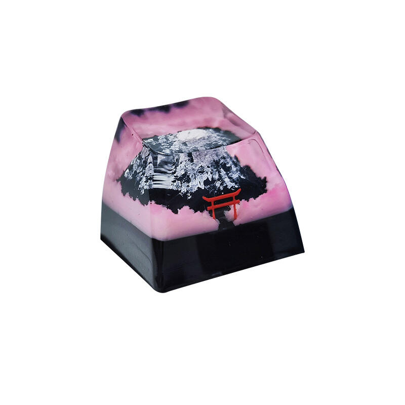 Each keycap features a detailed design that combines elements of a serene mountain and dynamic volcanic scenery. You might see the graceful silhouette of a snow-capped peak, perhaps with wisps of mist or smoke for a dramatic effect. The resin used gives the keycaps a smooth and glossy finish, and the unique translucent effect makes it seem as if the landscape is glowing under soft, ethereal light.