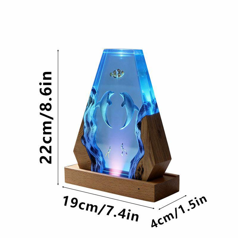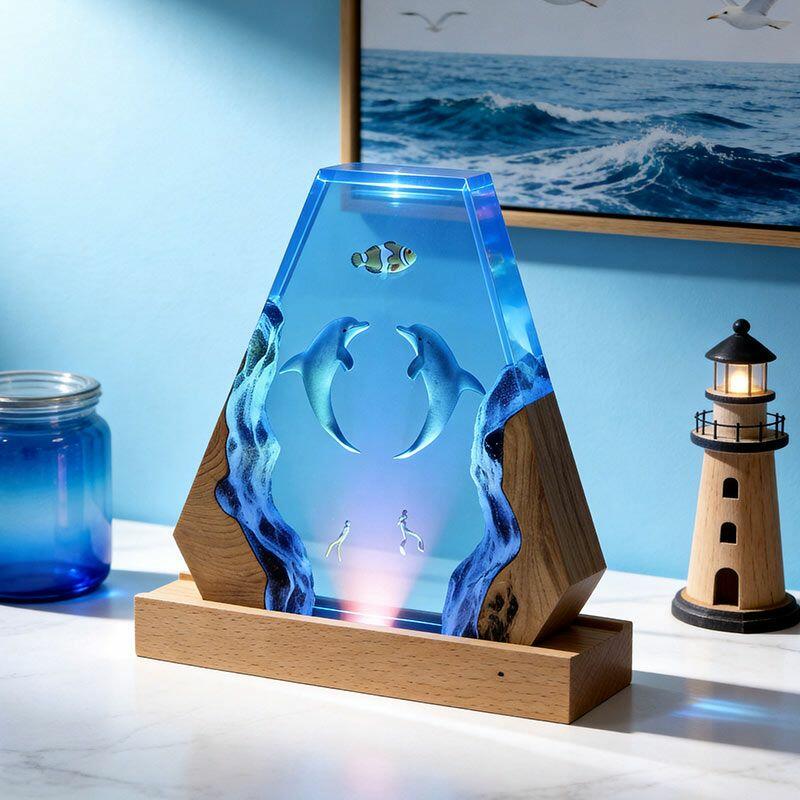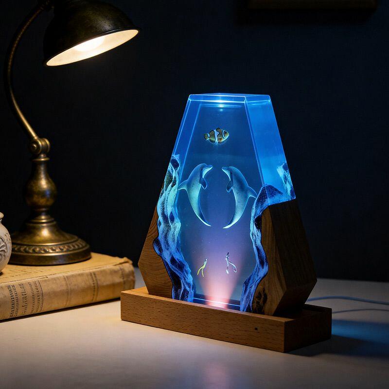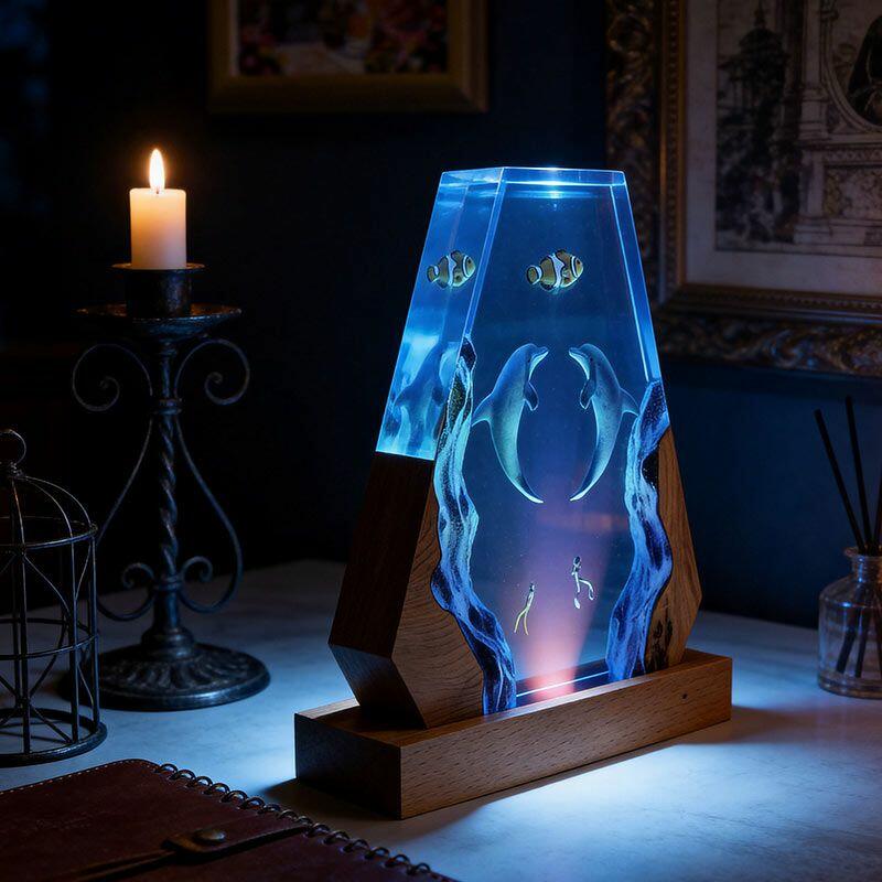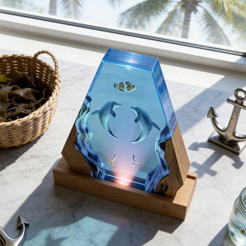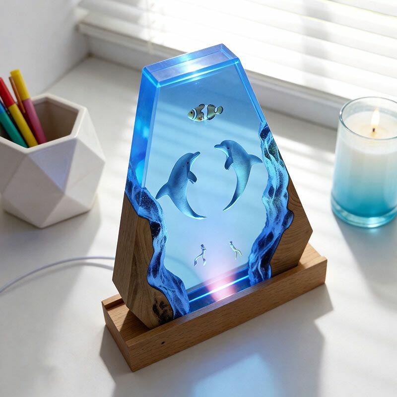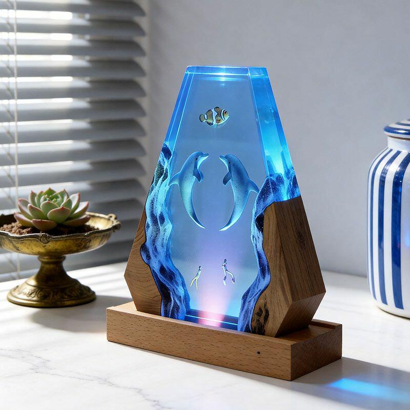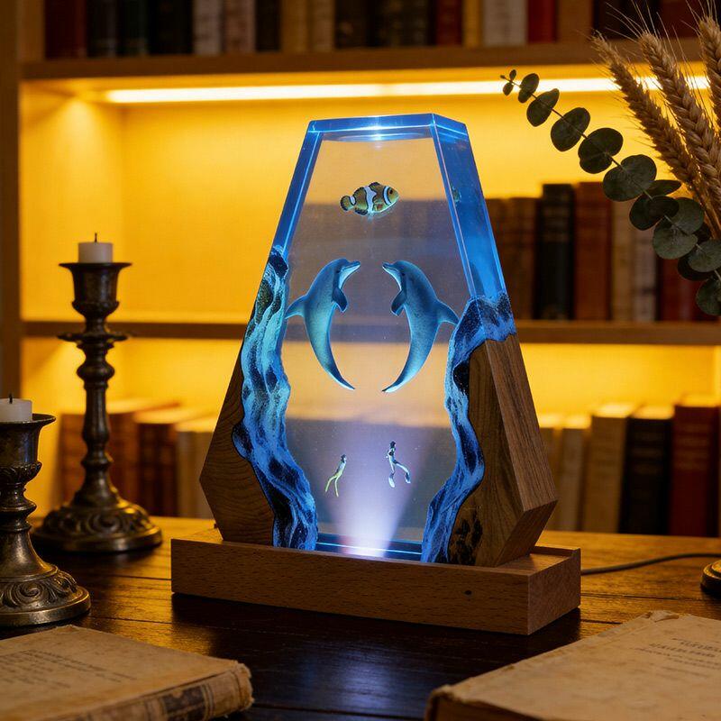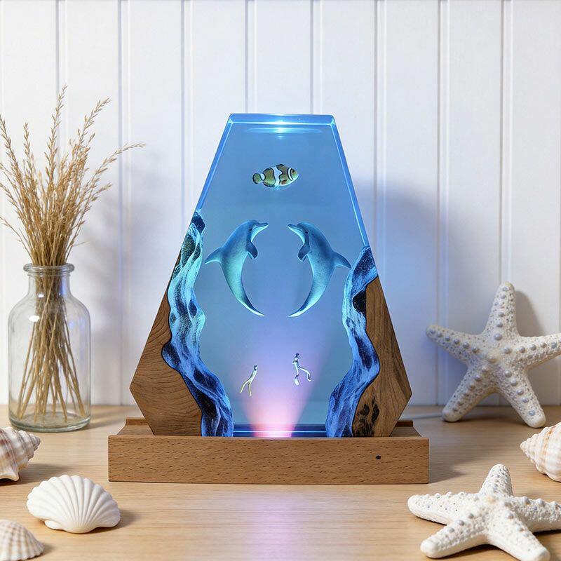 Celebrate love and the ocean’s allure with Reslol’s Loving Dolphin & Diver Resin Lamp, a handcrafted blend of wood and epoxy that tells a story of connection. This unique lamp captures the magic of the sea: two dolphins glide playfully, two divers explore hand-in-hand, and a vibrant clownfish weaves through the scene—all illuminated by a warm, soft glow that turns any space into a serene underwater haven.