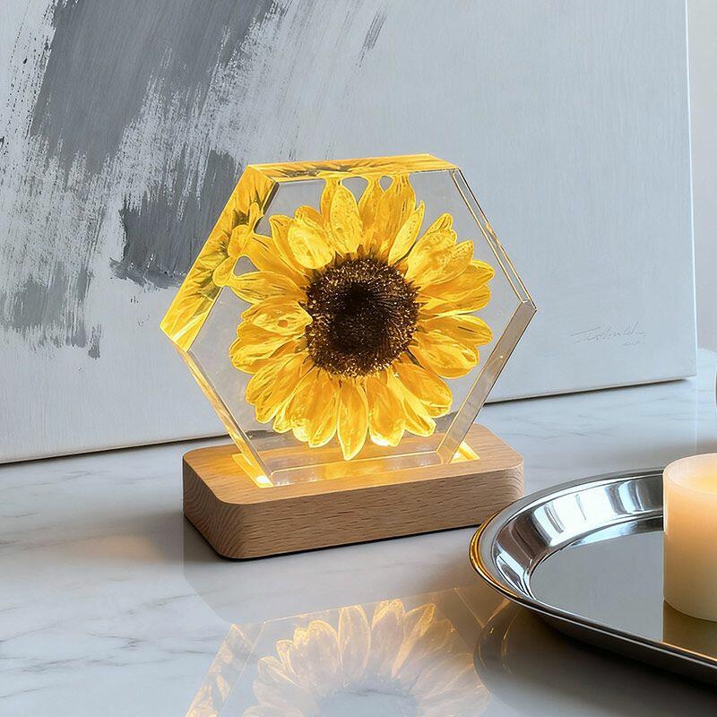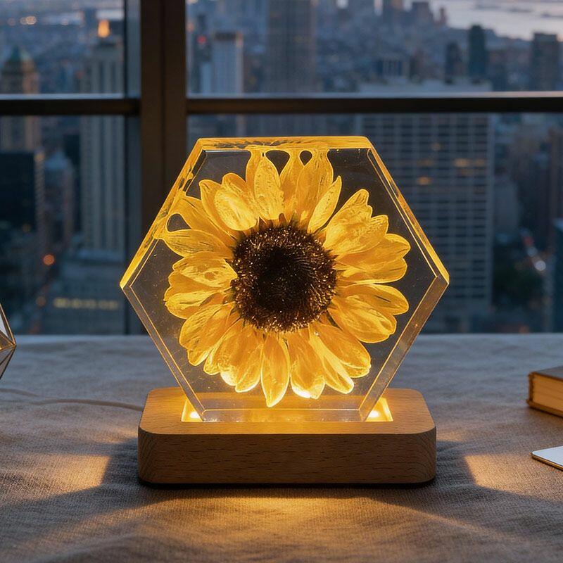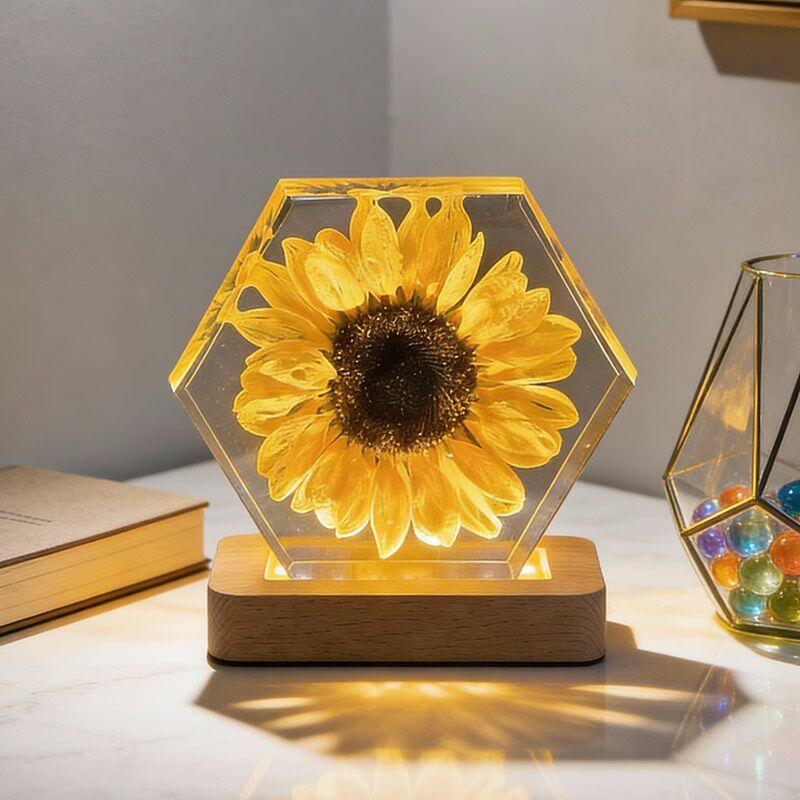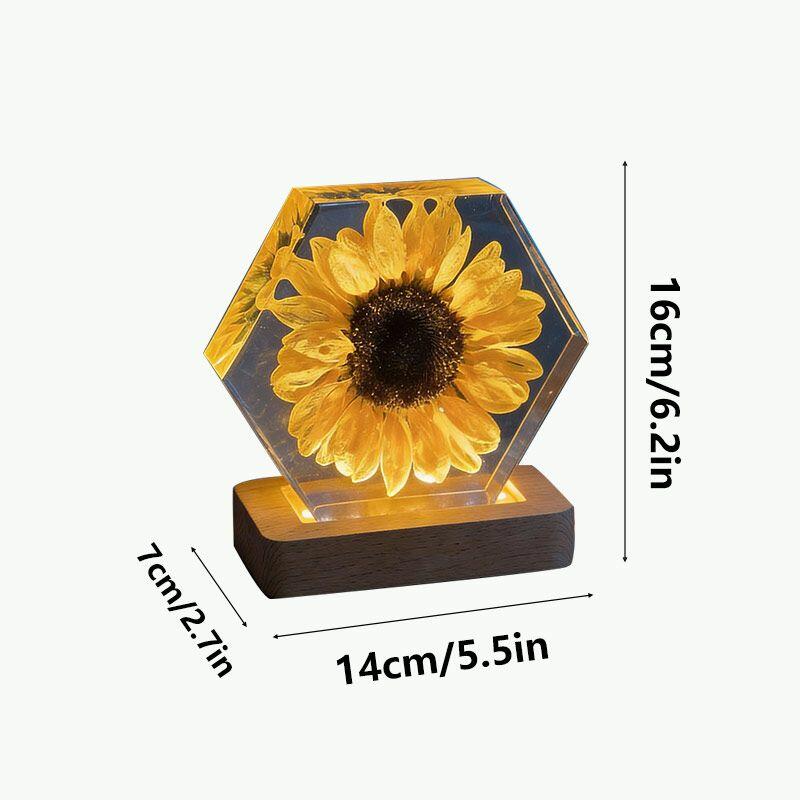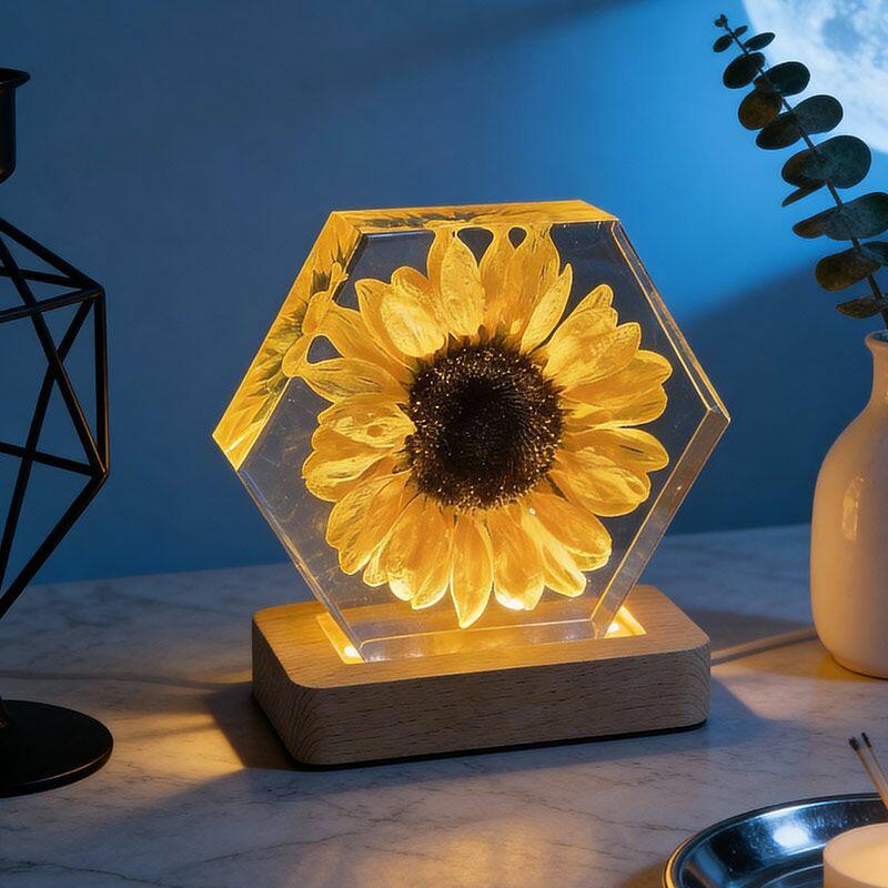Illuminate your space with the delicate beauty of nature. The Reslol Sunflower Resin Hexagon Night Light is a stunning fusion of eco-friendly resin and preserved sunflowers, capturing the warmth and vibrancy of summer all year round.