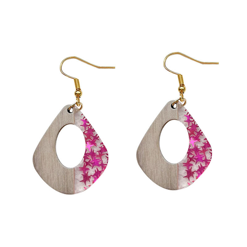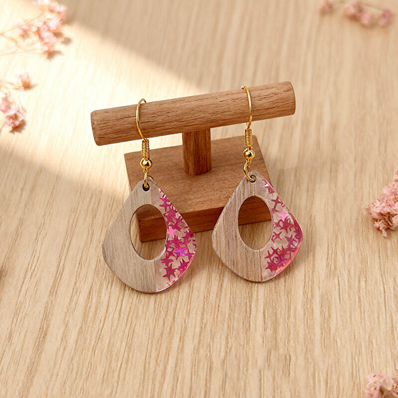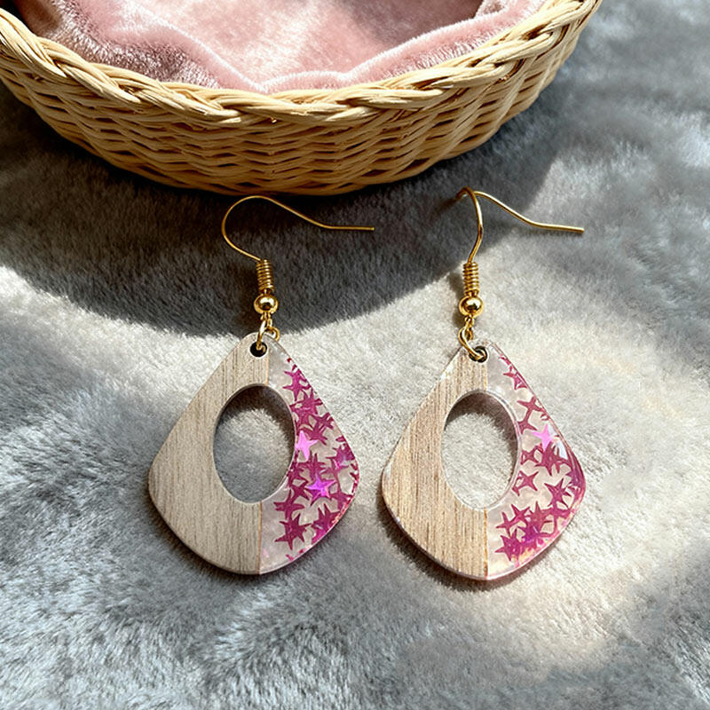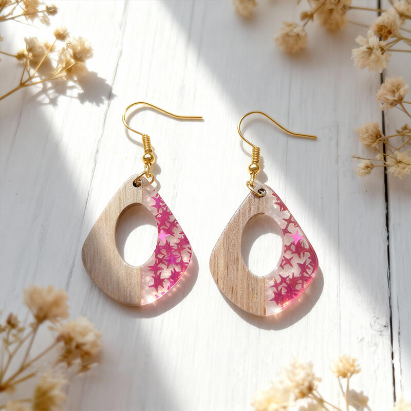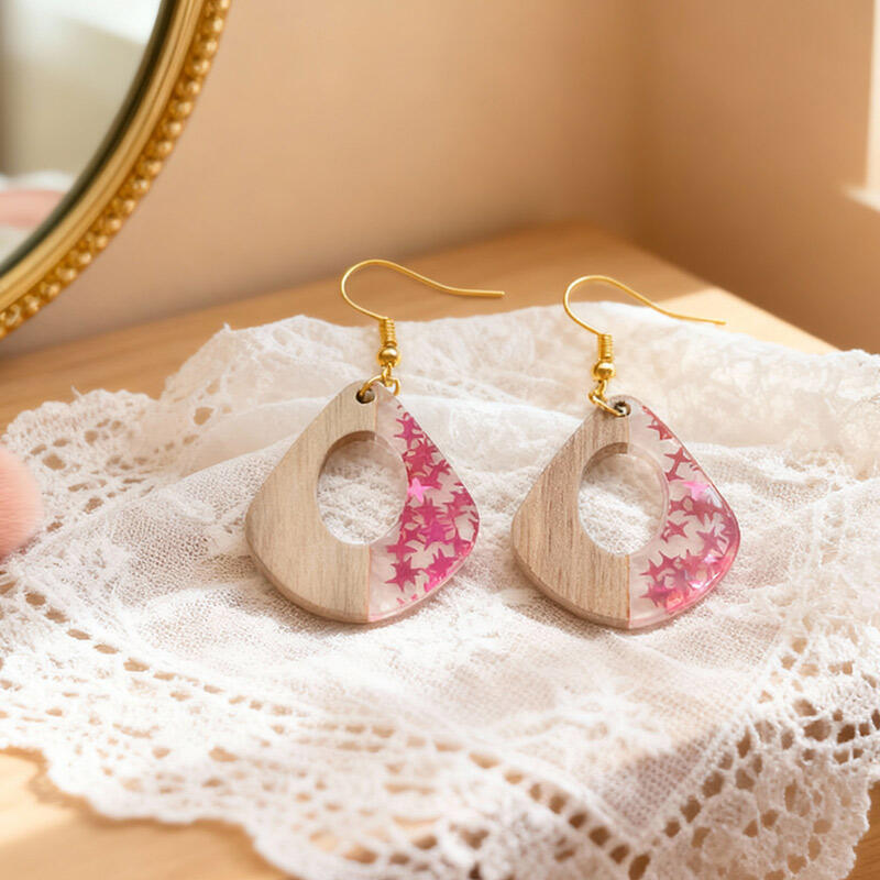 Rose Pink Star Geometric Wood Resin Earrings – Trendy Romantic Handmade Jewelry