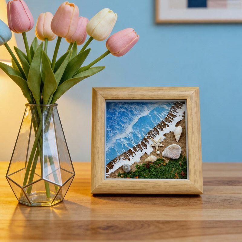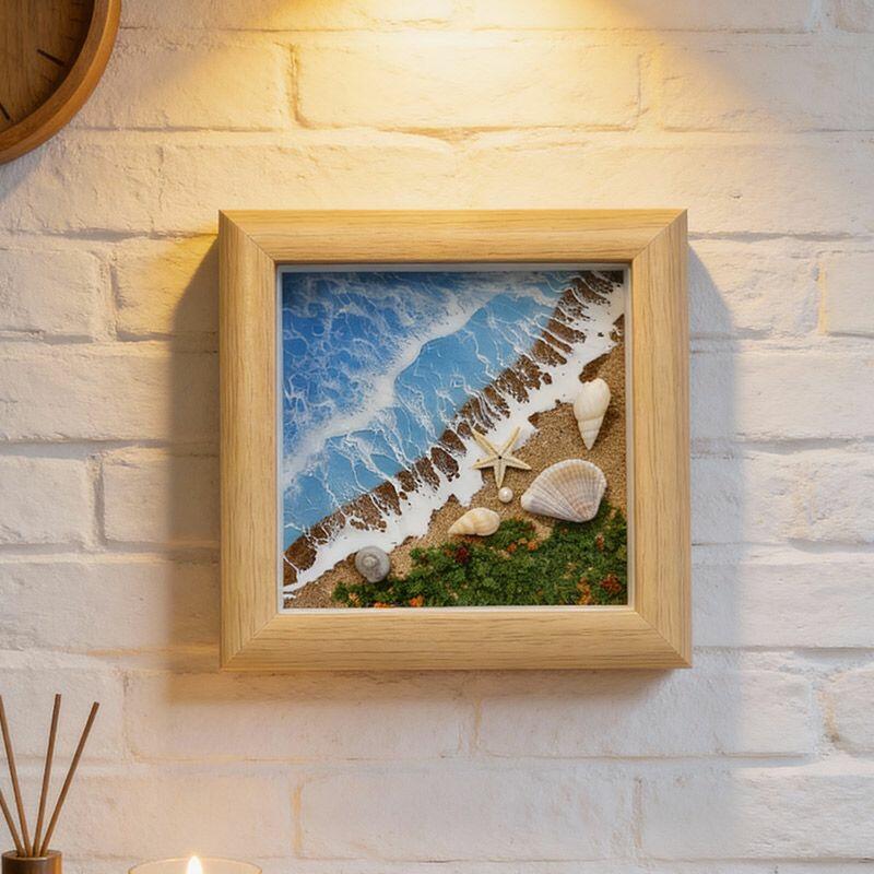 The 3D resin craftsmanship brings the scene to life: rolling waves appear to crash gently, while natural sand grains add tactile depth, and tiny shells are embedded like hidden treasures from the shore. Housed in a sleek square frame, it’s perfect for desks, shelves, or mantels—infusing any room with the calm of a quiet beach day.