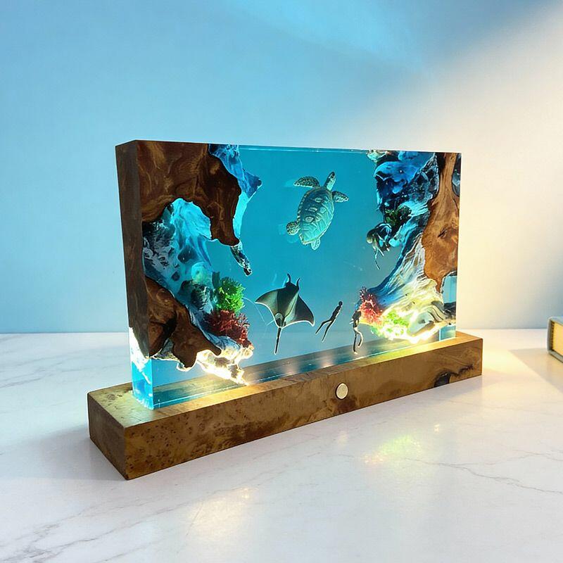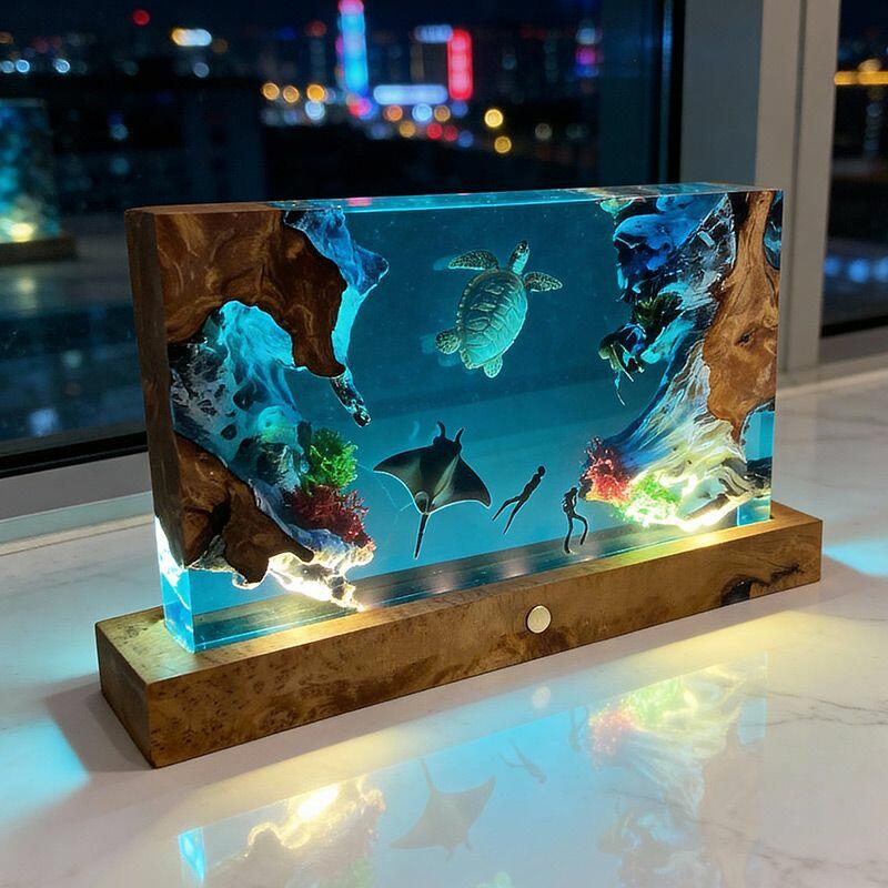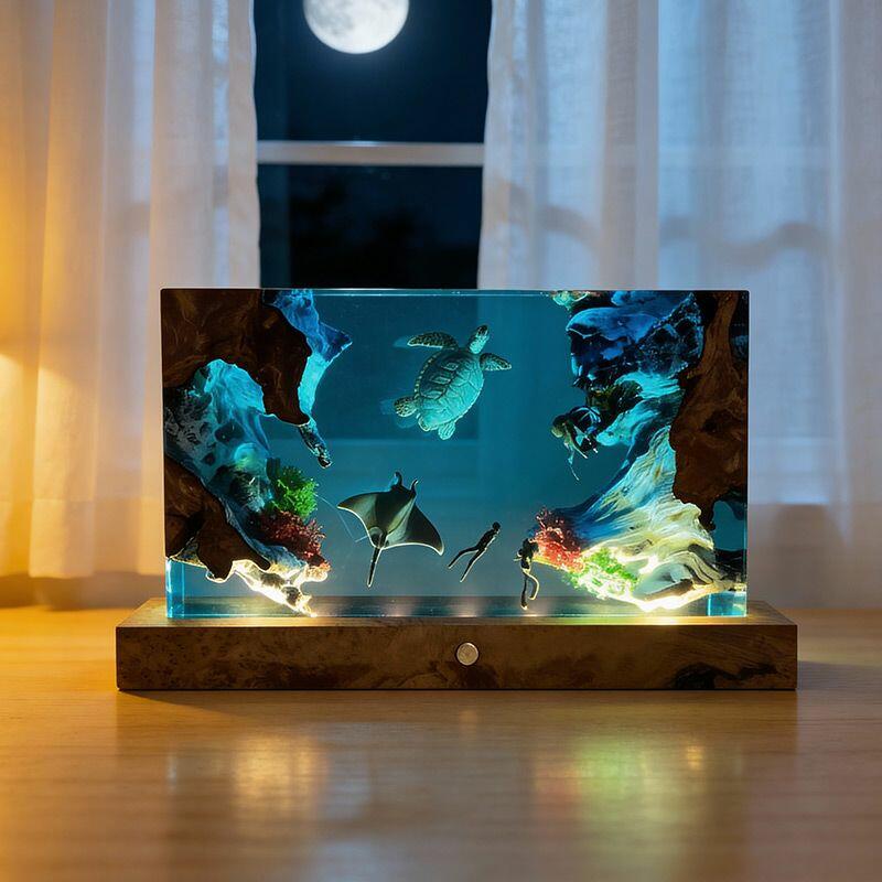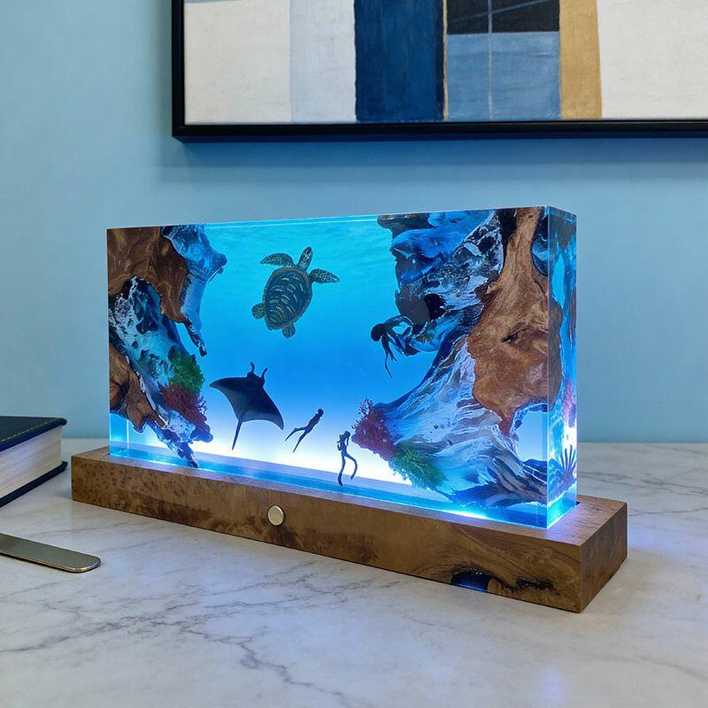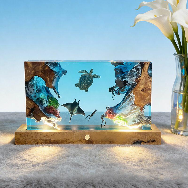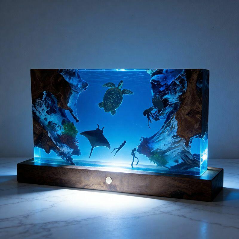 The rectangular lamp showcases intricate details: the diver, equipped with lifelike gear, explores the depths, while the turtle glides with smooth lines and the manta ray spreads its wings—all encapsulated in crystal-clear resin that mimics the ocean’s transparency. Soft ambient light illuminates the scene, creating a calming, underwater atmosphere perfect for bedrooms, living rooms, or nautical-themed spaces.