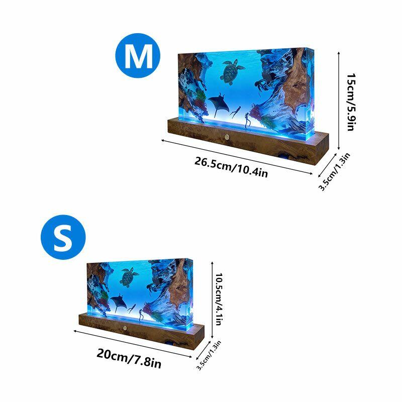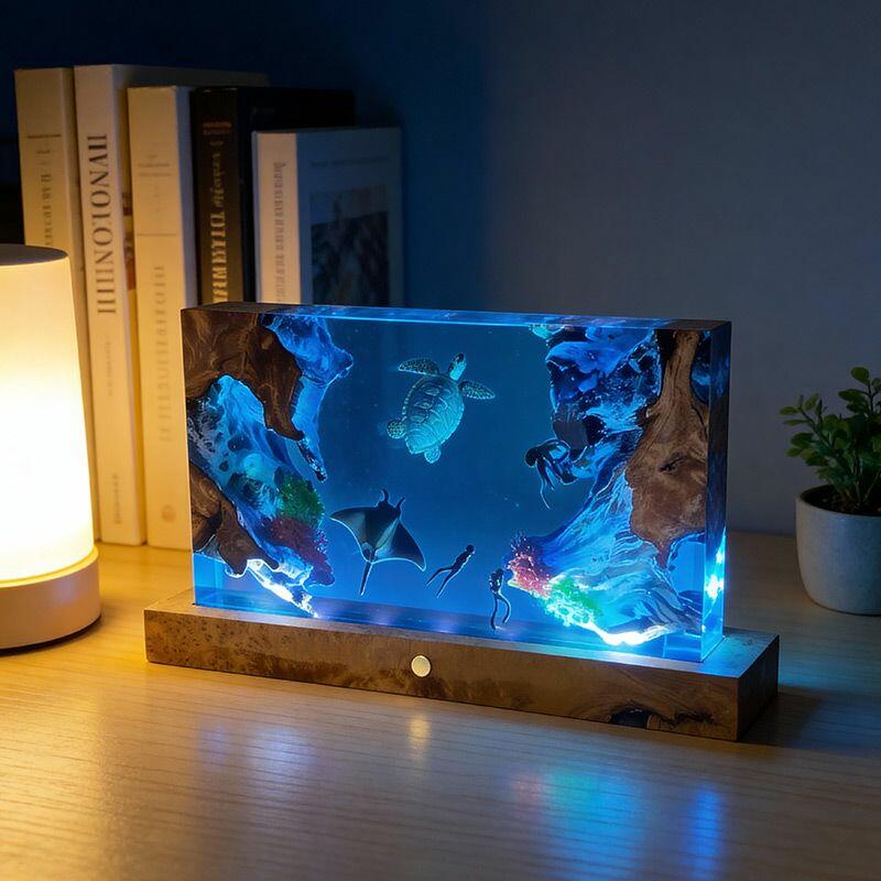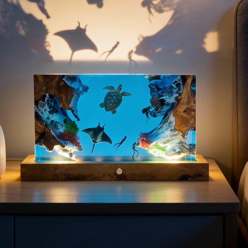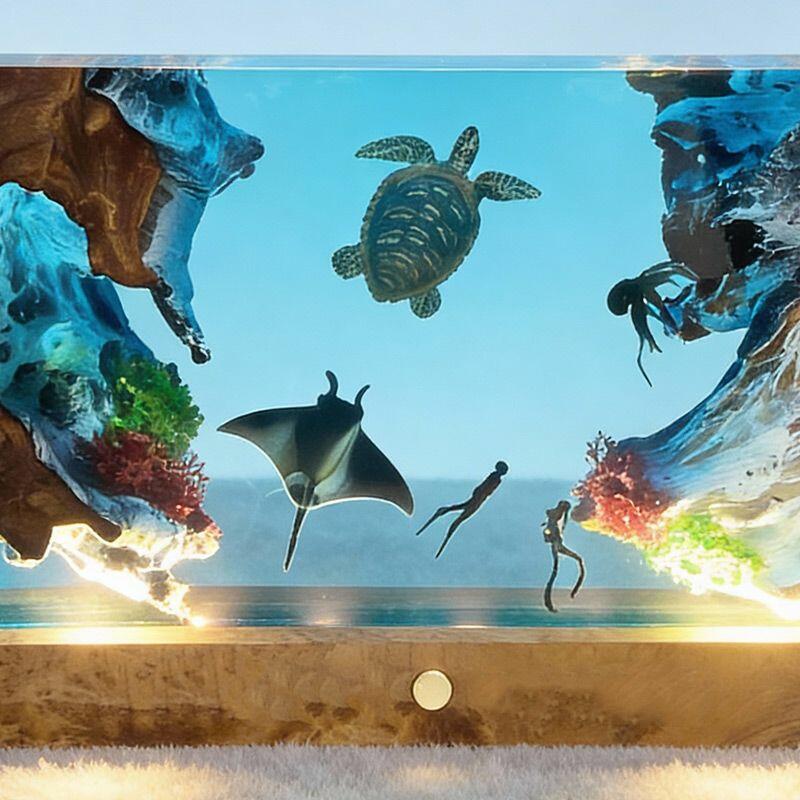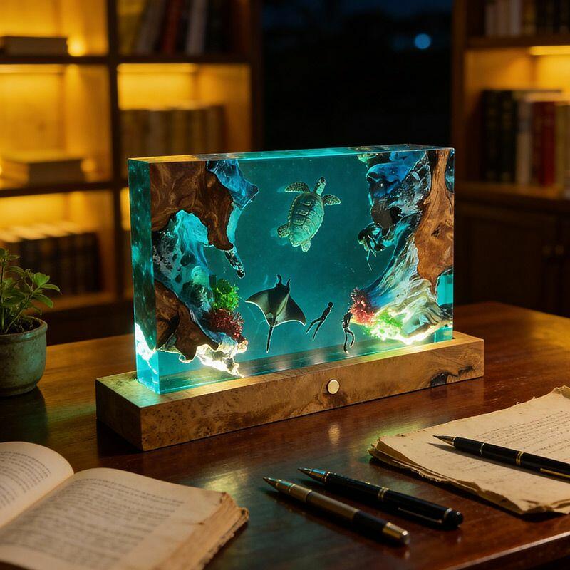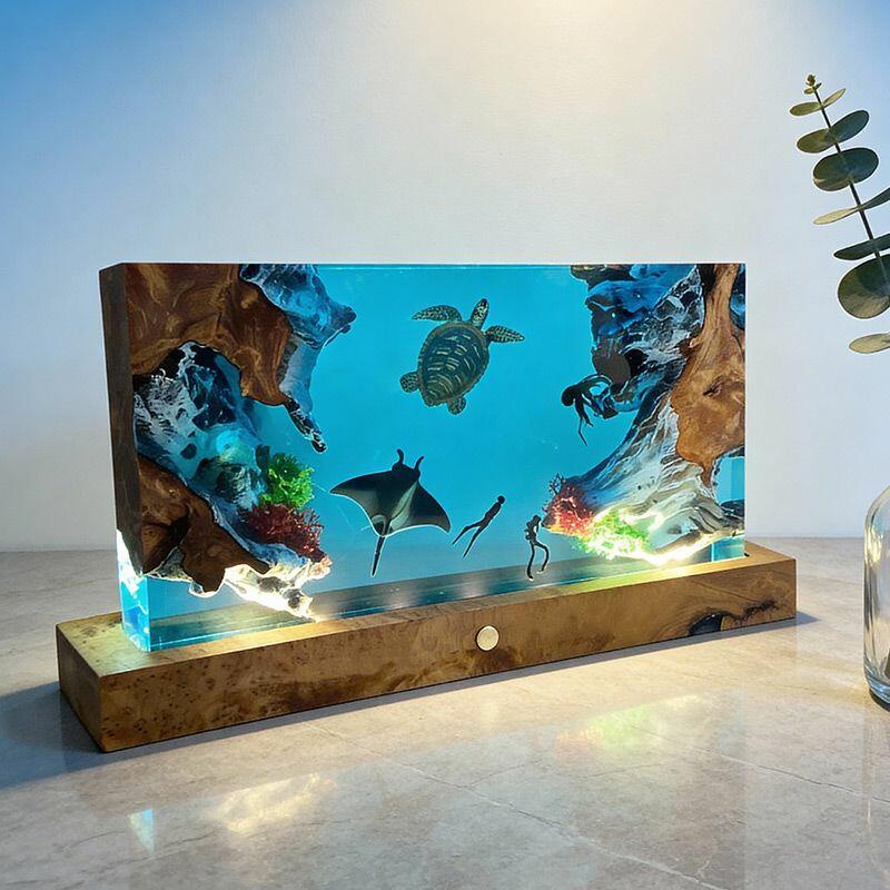 The rectangular lamp showcases intricate details: the diver, equipped with lifelike gear, explores the depths, while the turtle glides with smooth lines and the manta ray spreads its wings—all encapsulated in crystal-clear resin that mimics the ocean’s transparency. Soft ambient light illuminates the scene, creating a calming, underwater atmosphere perfect for bedrooms, living rooms, or nautical-themed spaces.