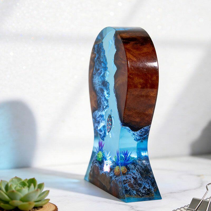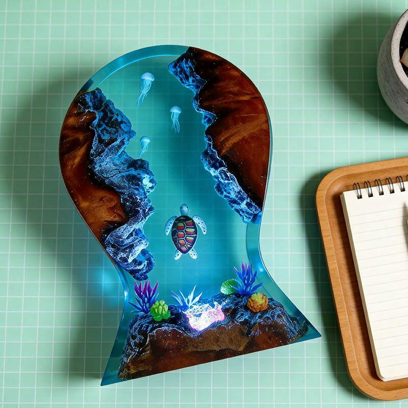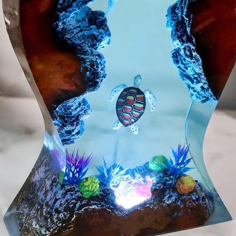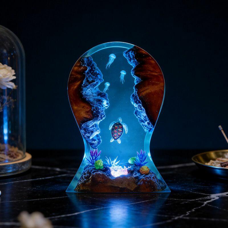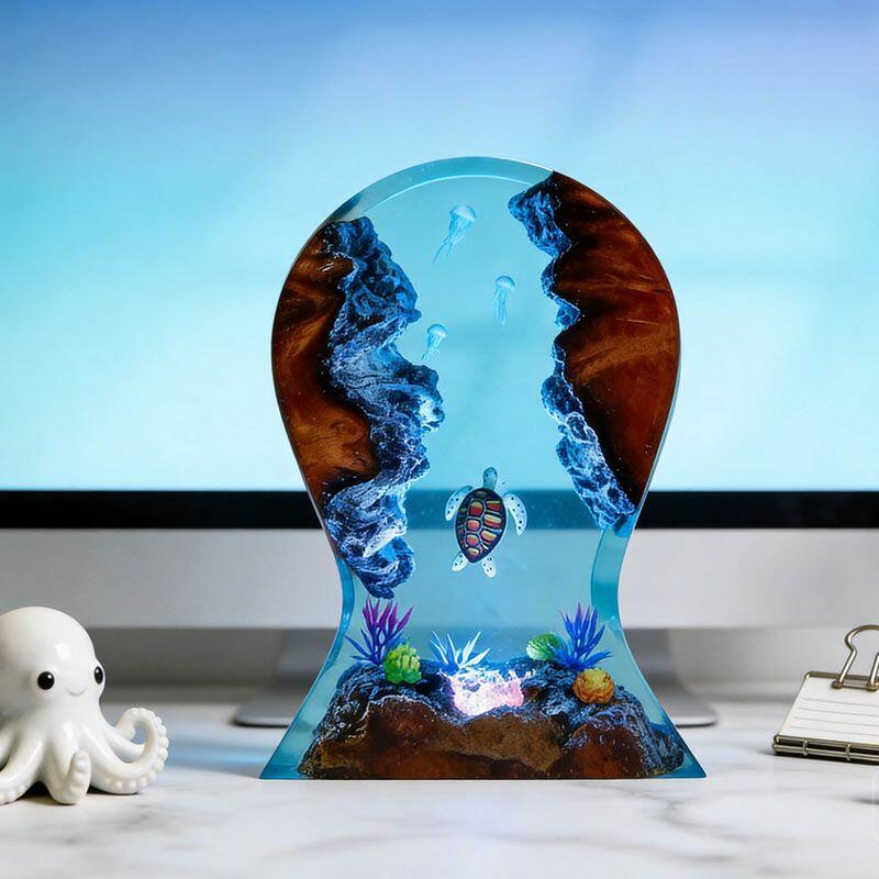 Dive into calm ocean vibes with Reslol’s Serene Turtle & Jellyfish Resin Lamp, where artisanal resin and reclaimed wood merge to create a functional masterpiece. This unique piece doubles as a headphone stand and desktop decor: a gentle sea turtle glides beneath translucent resin, while delicate jellyfish float alongside lush seafloor plants, all illuminated by a soft, warm glow that turns your desk into an underwater retreat.