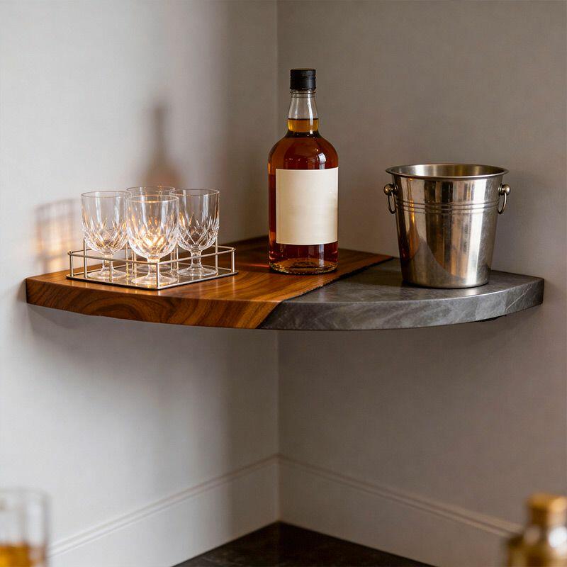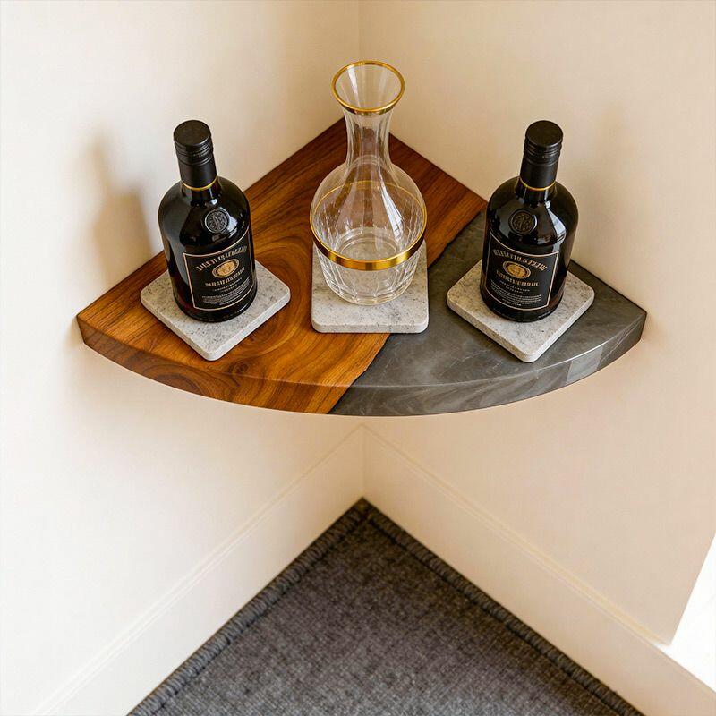 Reslol’s Handcrafted Live Edge Resin Wood Floating Corner Shelf merges nature’s beauty with modern design. The semicircular shape, paired with live wood edges and glossy resin, creates a striking floating display—ideal for showcasing decor, books, or wine bottles in your living room, kitchen, or study.
