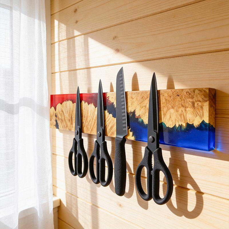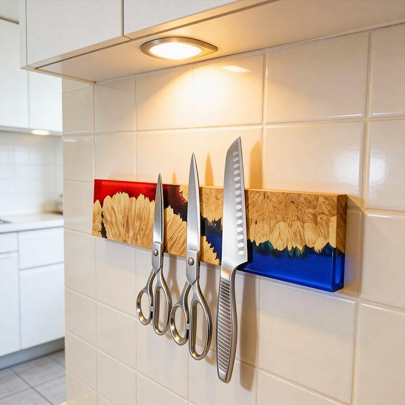 Elevate your kitchen with the Reslol Artisanal Translucent Red-Blue Gradient Resin Wood Magnetic Knife Holder, a fusion of functional storage and handcrafted artistry. Meticulously handmade from eco-friendly resin and natural solid wood, this wall-mounted organizer showcases a stunning translucent gradient of red and blue resin, swirling through warm wood grain to create a mesmerizing, light-catching display that doubles as kitchen decor.
