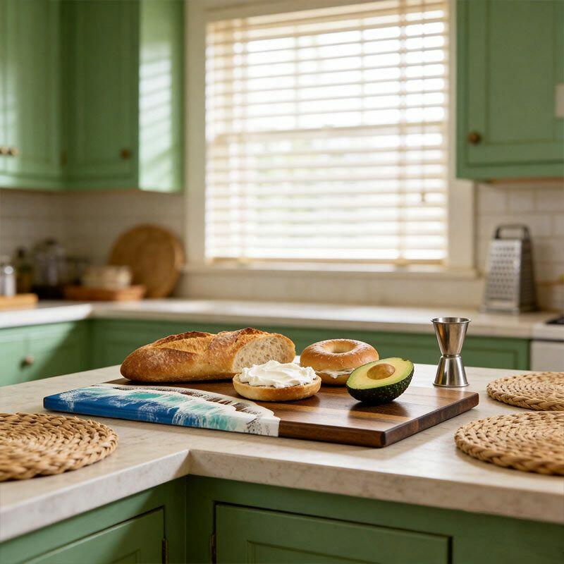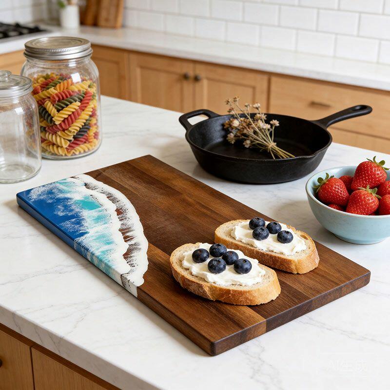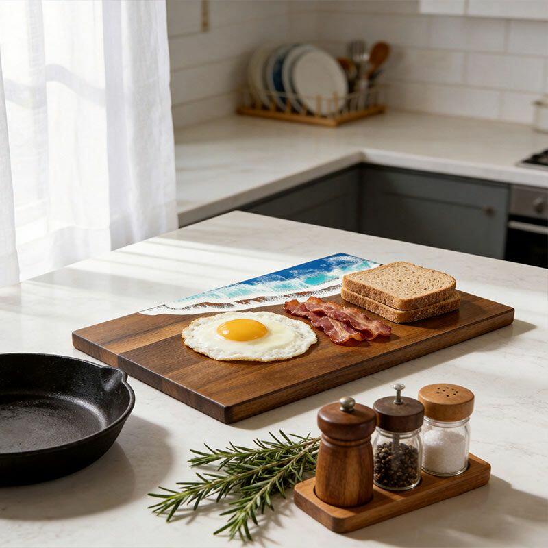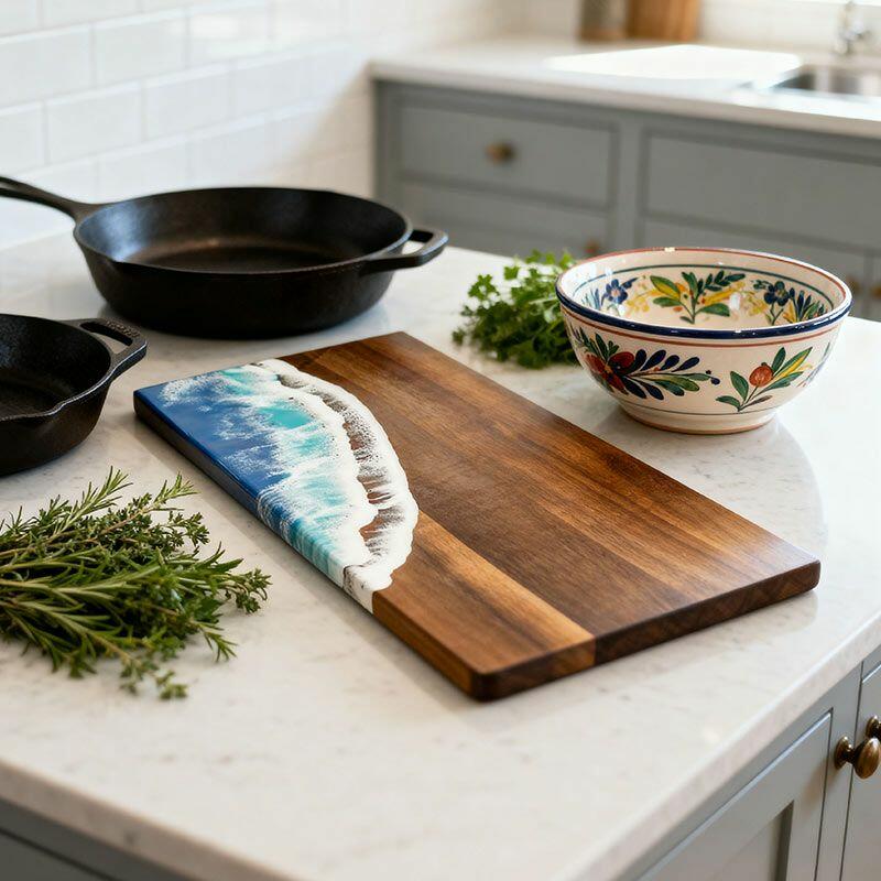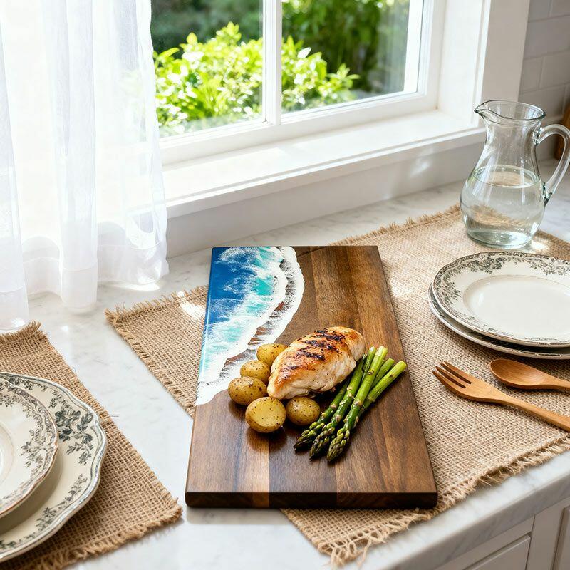 Elevate your kitchen with Reslol’s Artisanal Wave Resin & Wood Rectangular Cutting Board—a harmonious blend of eco-conscious craftsmanship and coastal charm. Handmade with reclaimed wood and premium resin, this board features a captivating wave design that mimics the ocean’s gentle flow, turning everyday meal prep into a visual delight.