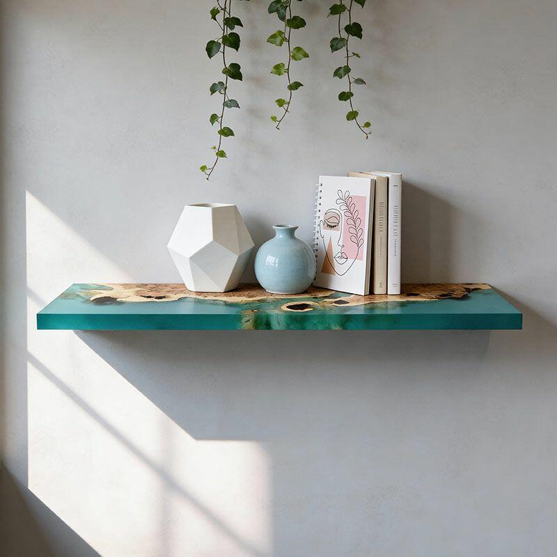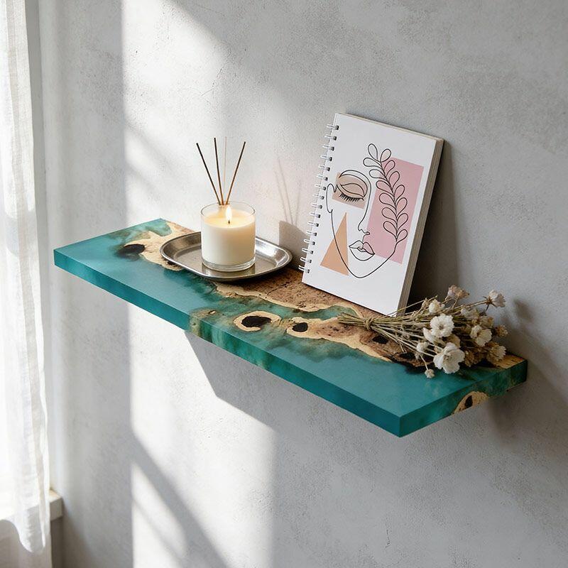Elevate your walls with the Reslol Verdant Translucent Resin & Wood Floating Shelf, a sleek fusion of modern design and natural artistry. Swirling translucent green resin wraps around solid wood, creating a light, airy focal point that celebrates the uniqueness of wood grains and resin’s luminous quality—crafted for durability and eco-friendly appeal.