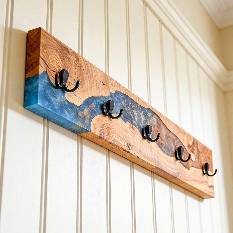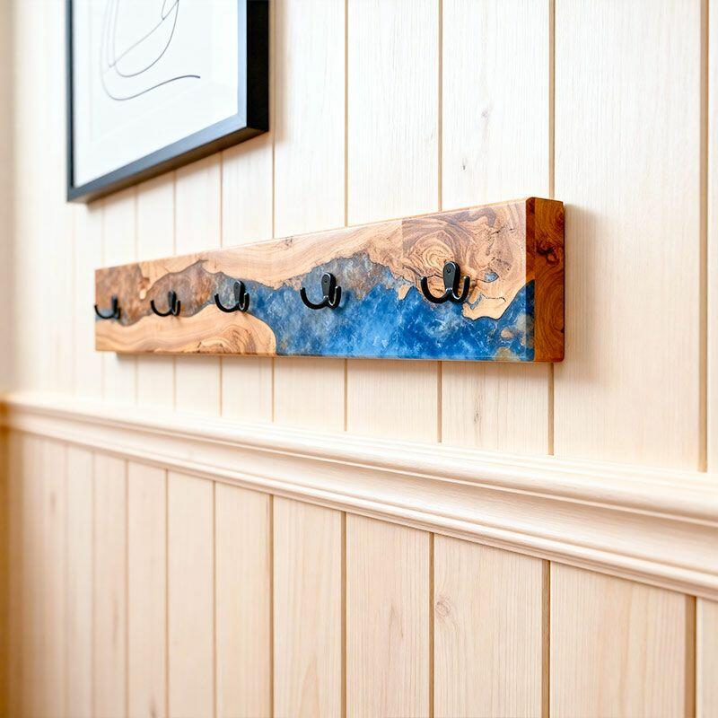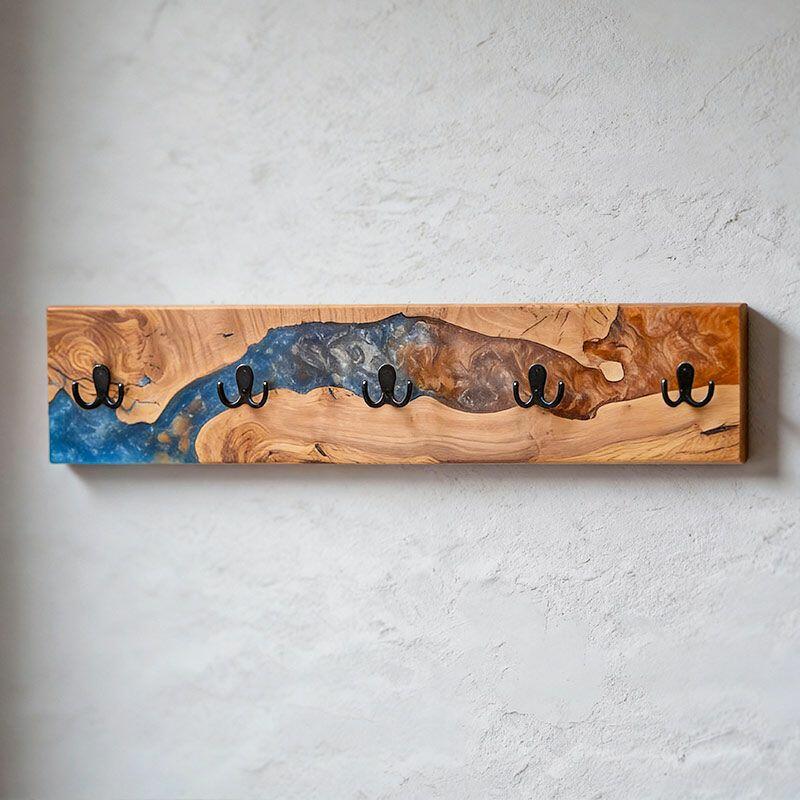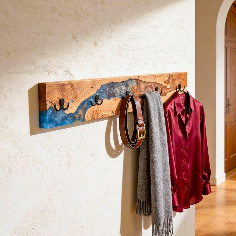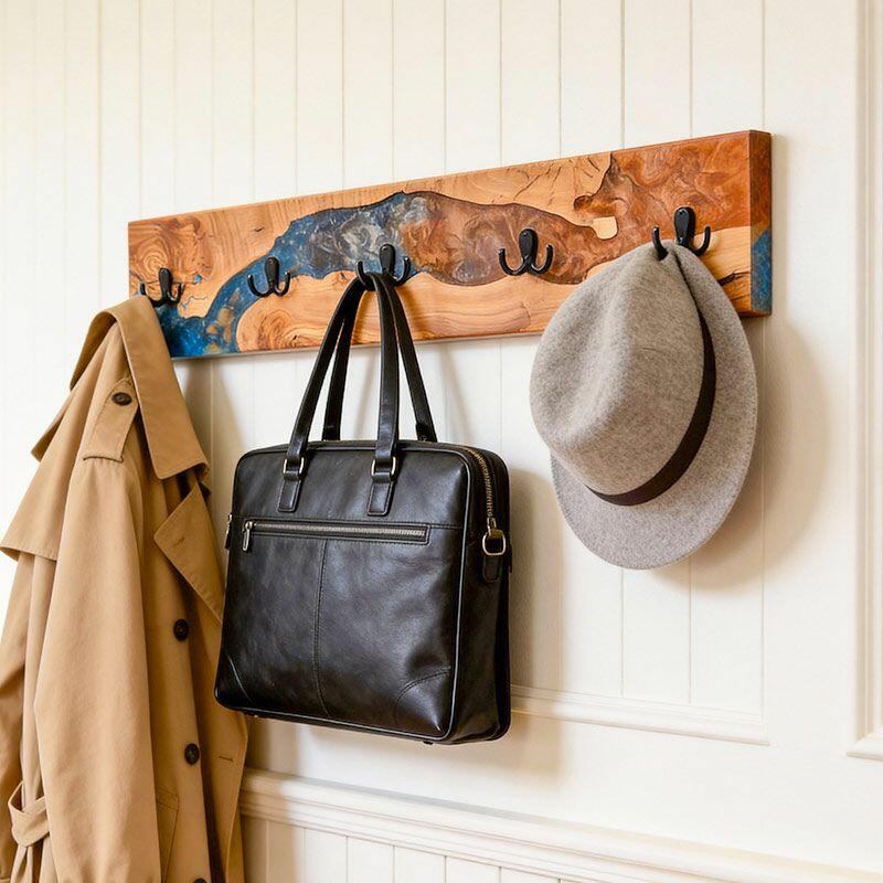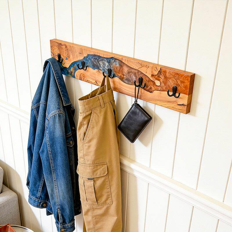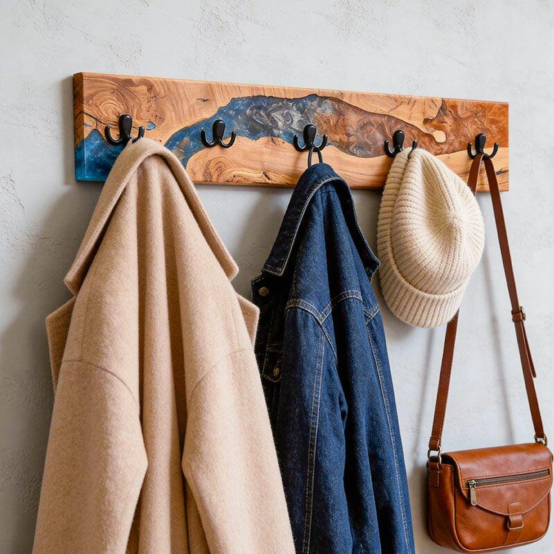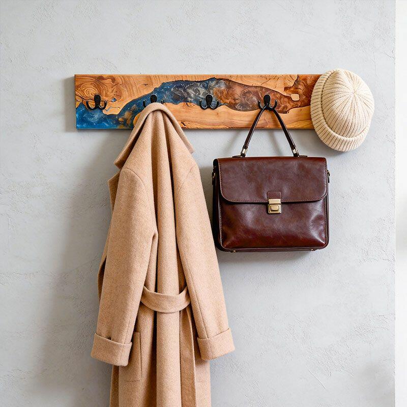 Reslol’s Artisan Orange-Blue Swirl Resin & Live Edge Wood Coat Rack is where nature meets color artistry. Handcrafted with natural live-edge wood—preserving the wood’s organic, raw edges—and vibrant orange-blue swirled epoxy resin, it transforms functional storage into a dynamic wall statement. The resin’s fluid, marbled pattern mimics a sunset over water, blending warm wood grain with bold, eye-catching hues for modern, artistic appeal.