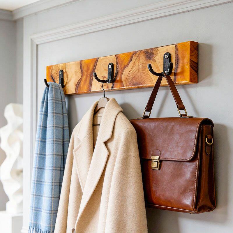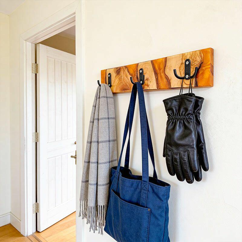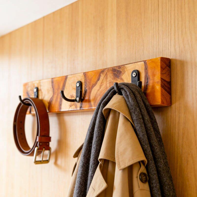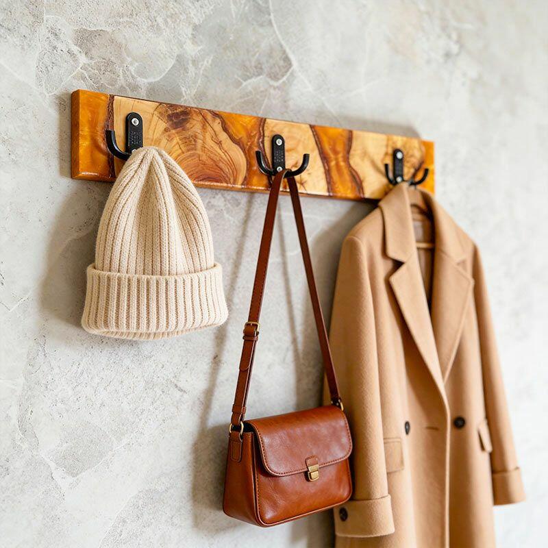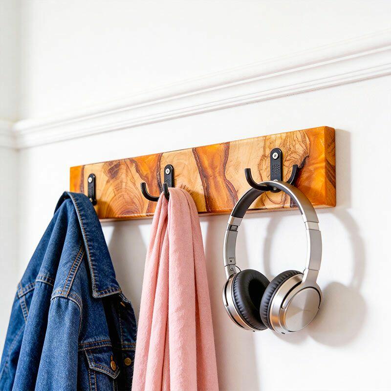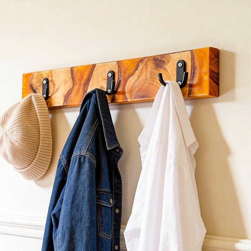 Available in multiple sizes, the hook quantity adjusts with size to fit your needs. Built for stability, it installs easily: two rear hooks secure firmly to walls with just two screws, making it a reliable storage solution. Each piece is uniquely handcrafted, so slight variations in wood grain, resin color, or measurements may occur—part of its one-of-a-kind appeal. Original design, no infringement issues.
