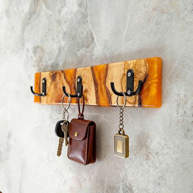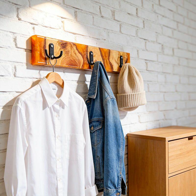 Introducing Reslol's Handcrafted Orange Resin & Wood Wall-Mounted Coat & Key Rack, where vibrant orange resin merges with natural wood to blend rustic charm and modern elegance. This artisanal piece isn't just storage—it's a statement of craftsmanship for your home.