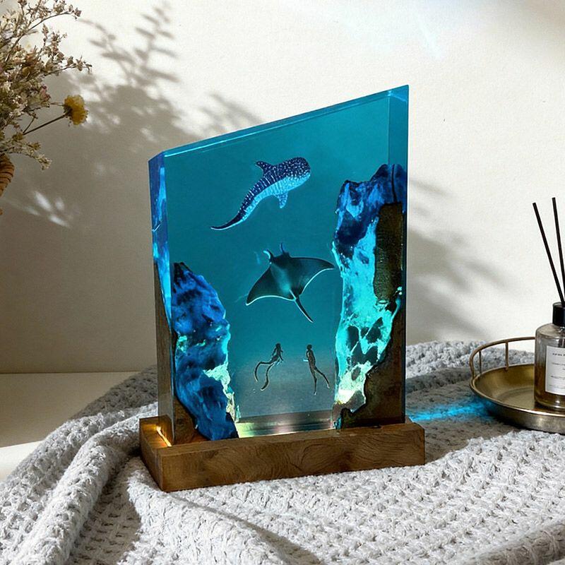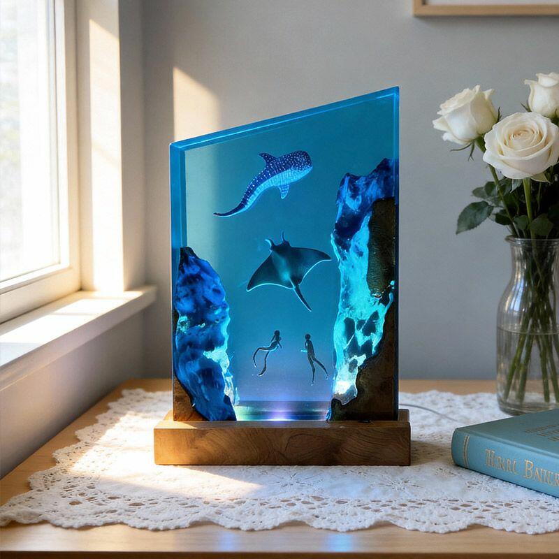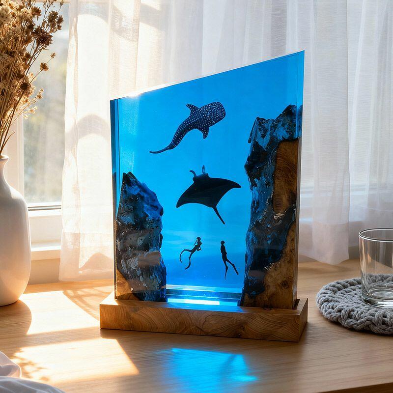 Plunge into the wonders of the deep with the Reslol Vibrant Underwater Trio Resin & Wood Lamp. This irregularly shaped masterpiece weaves reclaimed wood and clear resin to depict a lively underwater scene: a diver gliding beside a graceful manta ray and a gentle whale shark, each detail hand-sculpted to capture the magic of marine life.