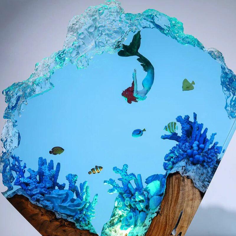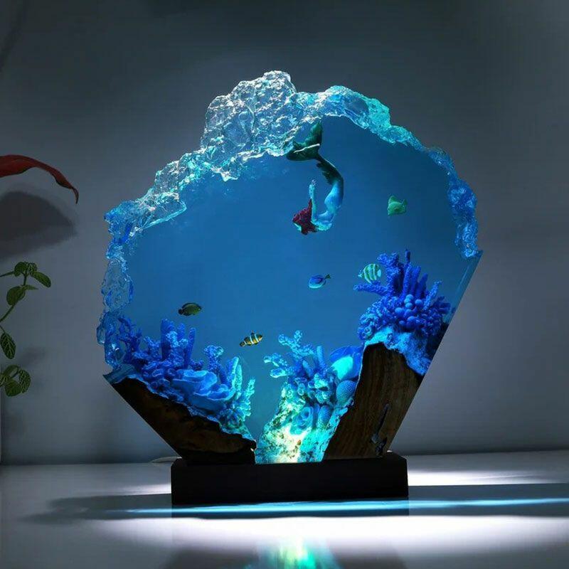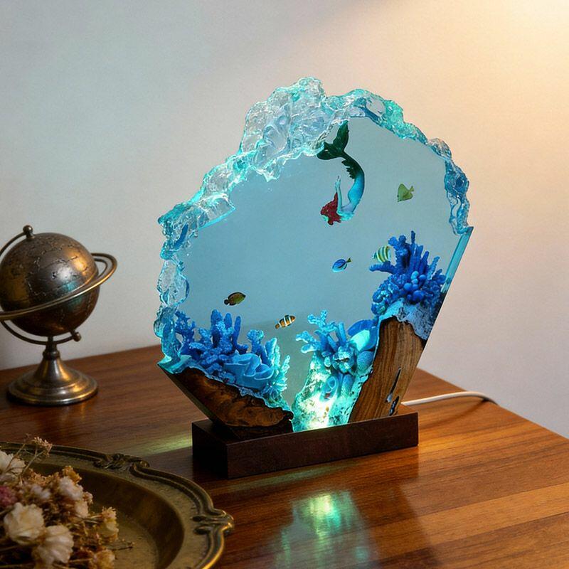 Whimsical Underwater Mermaid Resin Wood Lamp - Irregular Nautical Art
