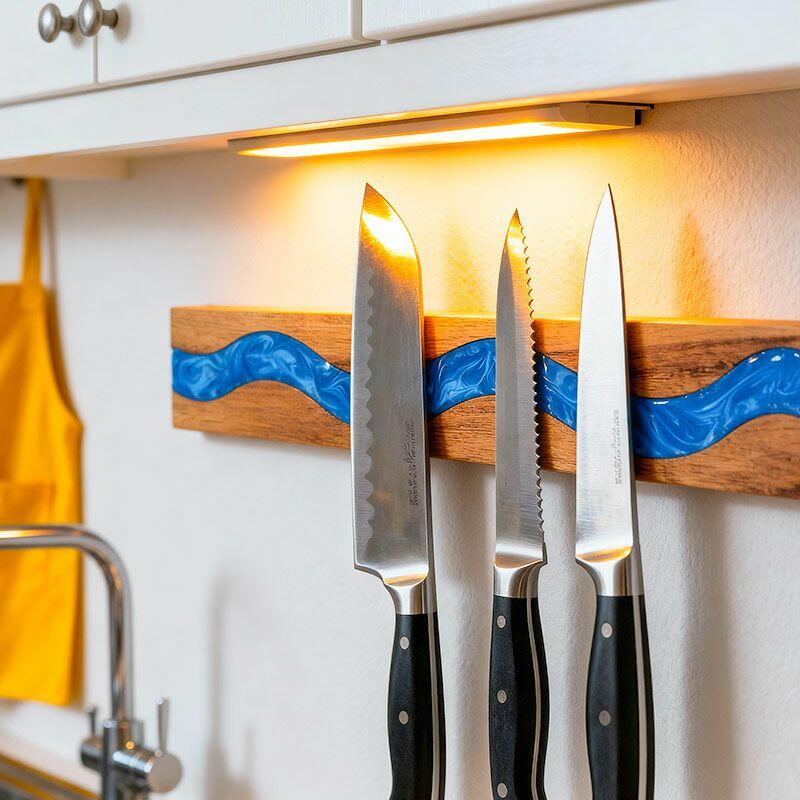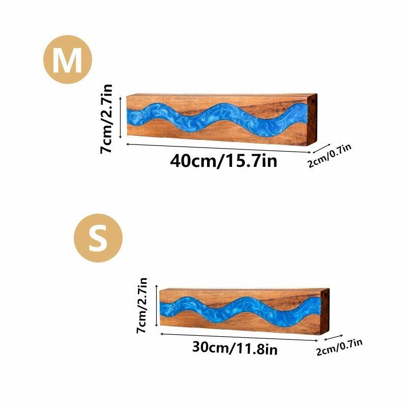 Designed for daily convenience, it comes in two sizes to fit your kitchen layout, ensuring space for all your essential blades. The strong magnetic strip securely holds knives, while the durable resin and wood construction guarantee long-lasting use. Each piece showcases the unique beauty of natural wood—grain patterns vary slightly, making every holder one-of-a-kind, and the blue resin adds a calming, coastal-inspired touch.