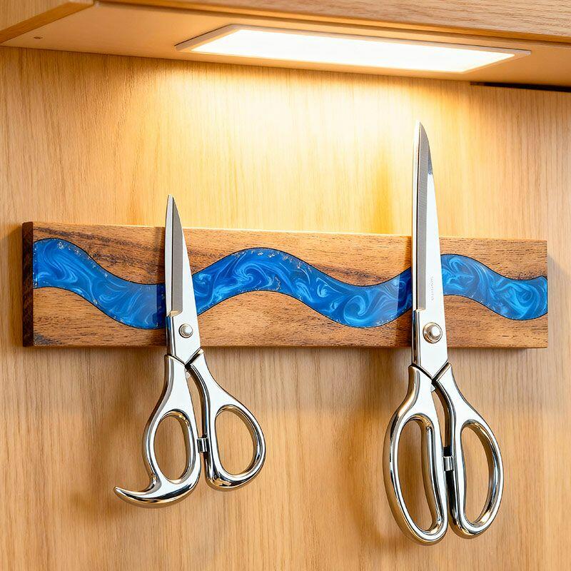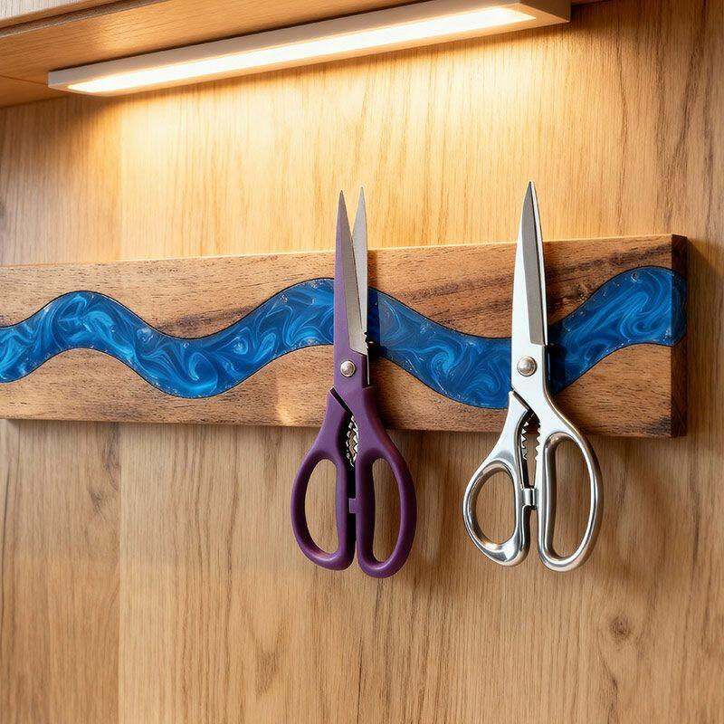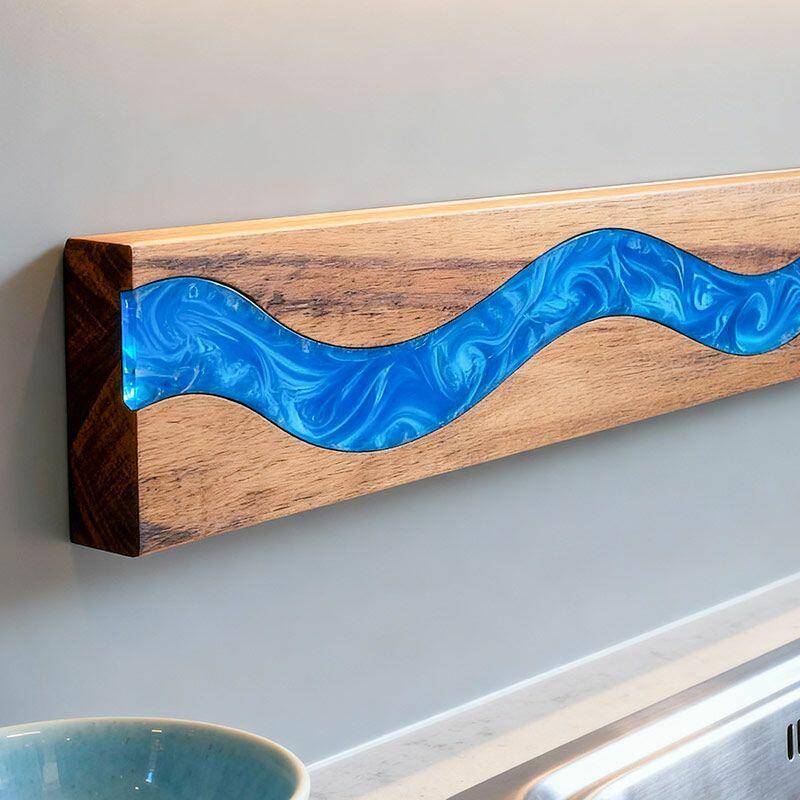 Elevate your kitchen with Reslol’s Handcrafted Ocean Blue Resin Wood Magnetic Knife Holder—a perfect blend of artistry and functionality. This wall-mounted piece features smooth, vibrant blue resin swirled with natural solid wood, creating a fresh, modern accent that keeps your knives organized and within reach.